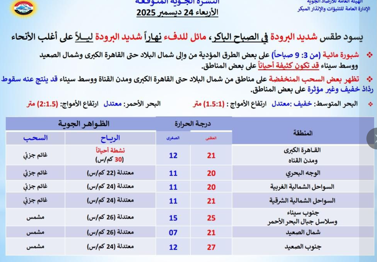 شمال الصعيد: العظمى 21° والصغرى 7°