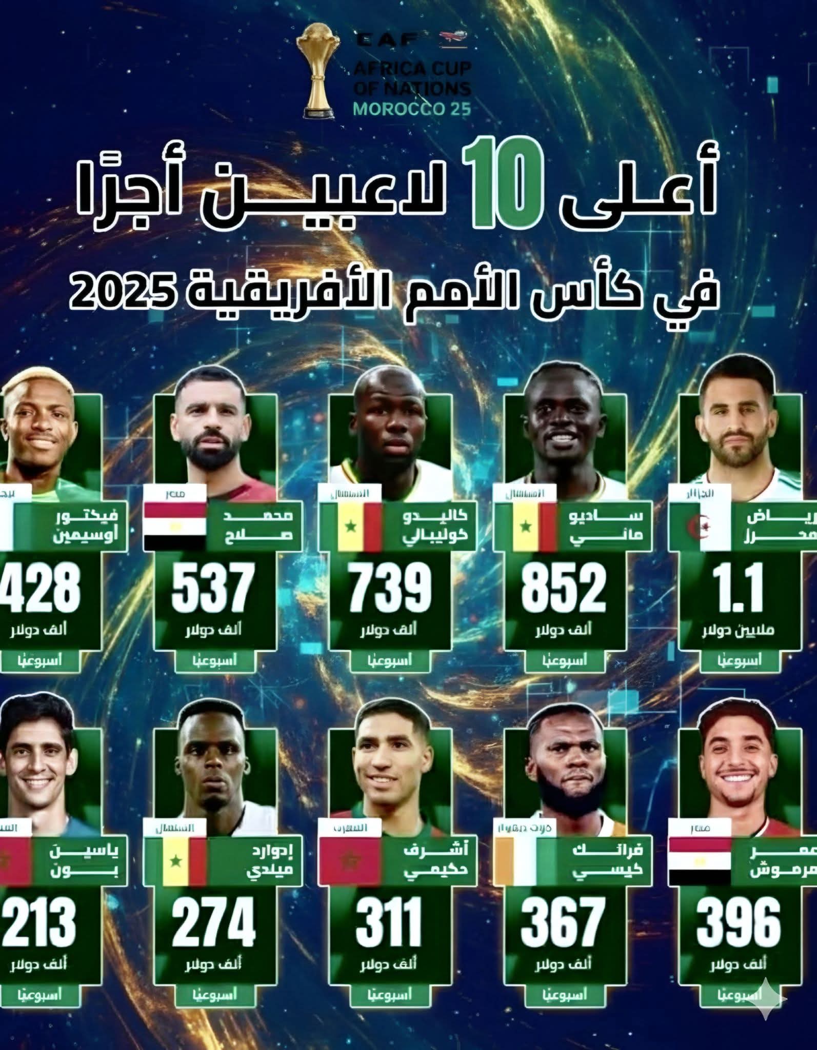 وكتب خالد طلعت عبر صفحته على موقع التواصل الاجتماعي فيسبوك:"أعلى 10 لاعبين من حيث الراتب (الأسبوعي) من المشاركين في كأس أمم أفريقيا