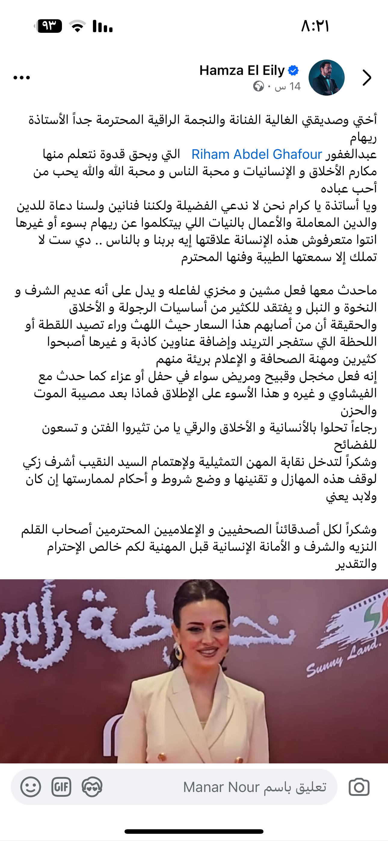 وكتب العيلي، عبر حسابه الشخصي على “فيسبوك”: “أختي وصديقتي الغالية الفنانة والنجمة الراقية المحترمة جداً الأستاذة ريهام عبد الغفور التي وبحق قدوة نتعلم منها مكارم الأخلاق والإنسانيات ومحبة الناس ومحبة الله والله يحب من أحب عباده..