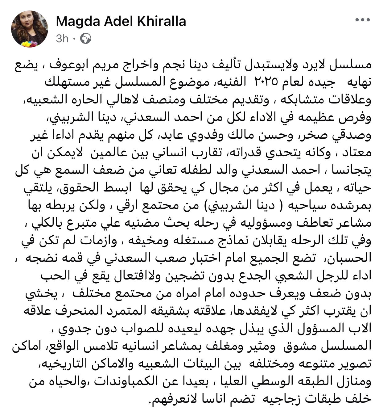 أشادت الناقدة الفنية ماجدة خيرالله بمسلسل “لا يُرد ولا يُستبدل”، مؤكدة أنه يضع نهاية جيدة للعام الفني 2025، لما يحمله من موضوع غير مستهلك ومعالجة درامية مختلفة، إلى جانب تقديم منصف وغير نمطي لأهالي الحارة الشعبية.