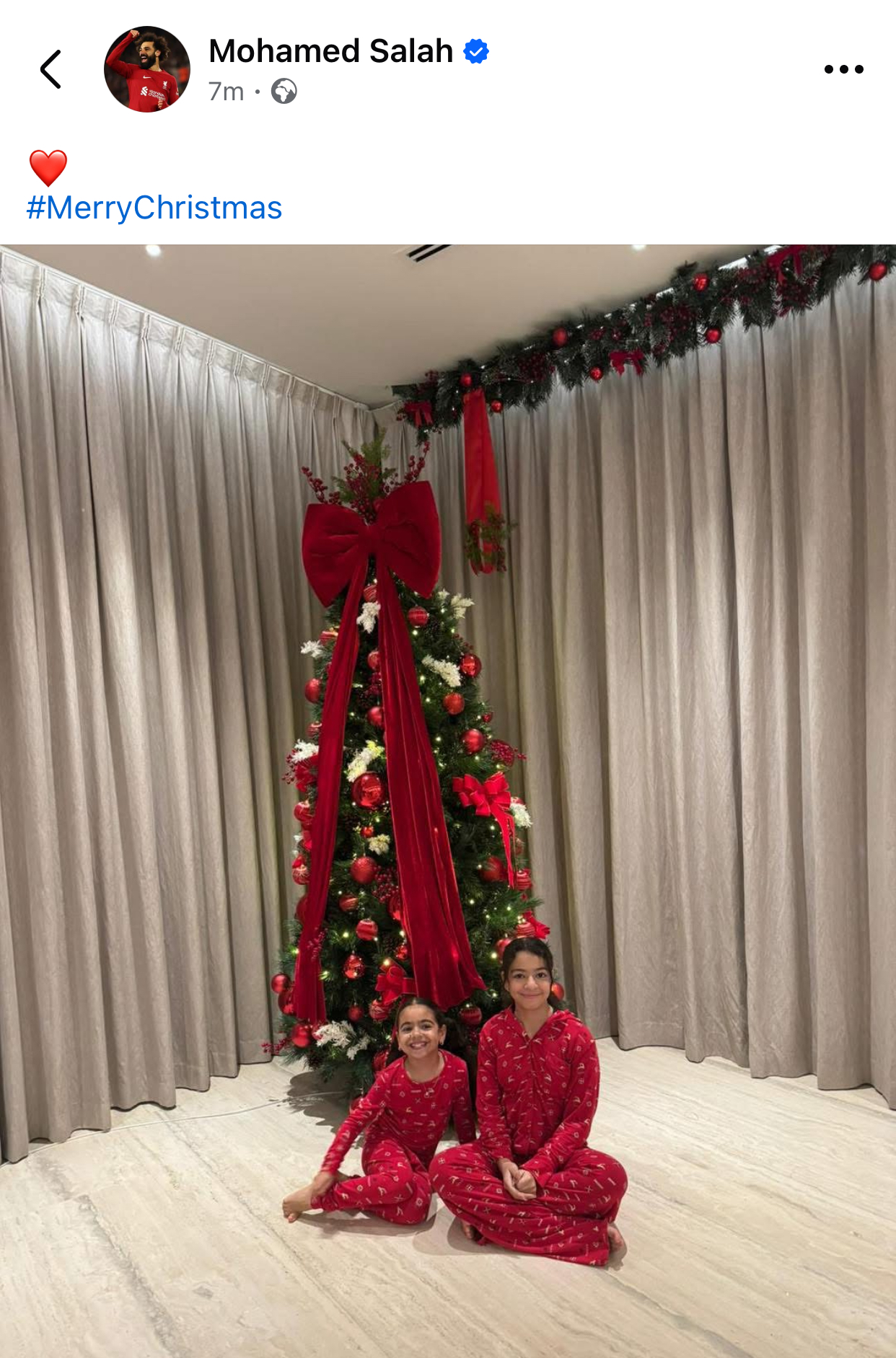 شارك محمد صلاح، نجم منتخب مصر ولاعب نادي ليفربول الإنجليزي، متابعيه بصورة جديدة لبناته مكة وكيان محمد صلاح، احتفالًا بعيد الميلاد.