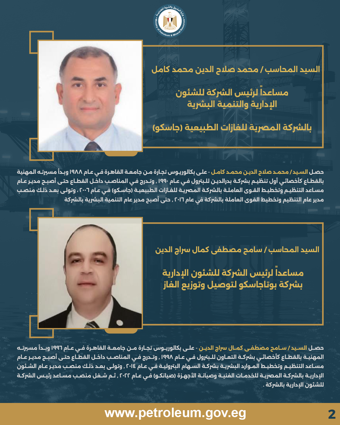 شملت تعيين نائب العضو المنتدب التنفيذي للشركة المصرية القابضة للغازات الطبيعية للشئون الإدارية، إلى جانب تكليف مساعدين لرؤساء مجالس الإدارة ومديري عموم للشئون الإدارية بعدد من الشركات، وذلك في إطار دعم المواقع القيادية بالكفاءات وتعظيم الاستفادة من الخبرات المختلفة .