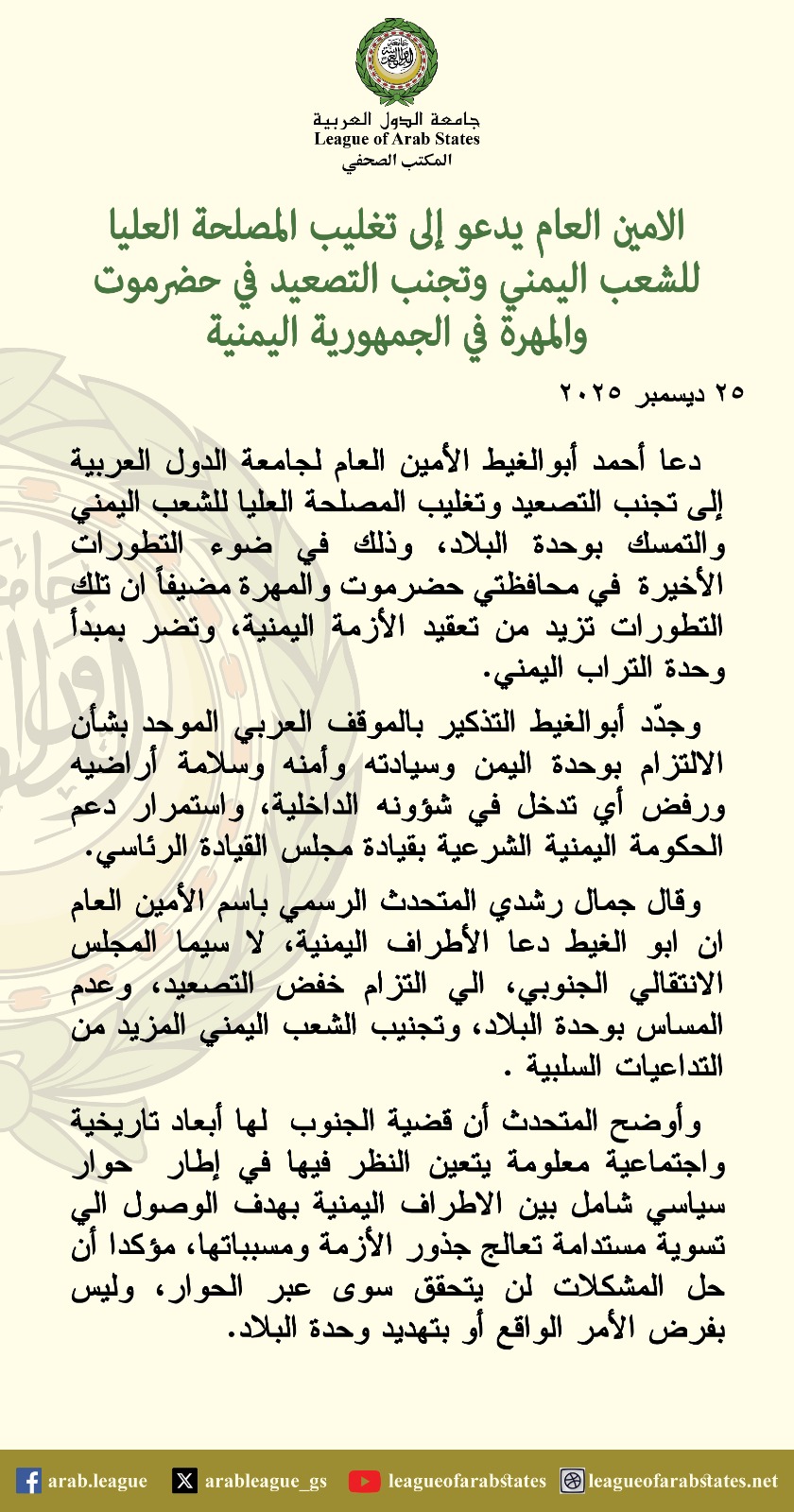 دعا أحمد أبو الغيط الأمين العام لجامعة الدول العربية إلى تجنب التصعيد وتغليب المصلحة العليا للشعب اليمني والتمسك بوحدة البلاد، وذلك في ضوء التطورات الأخيرة في محافظتي حضرموت والمهرة، مضيفاً أن تلك التطورات تزيد من تعقيد الأزمة اليمنية، وتضر بمبدأ وحدة التراب اليمني.