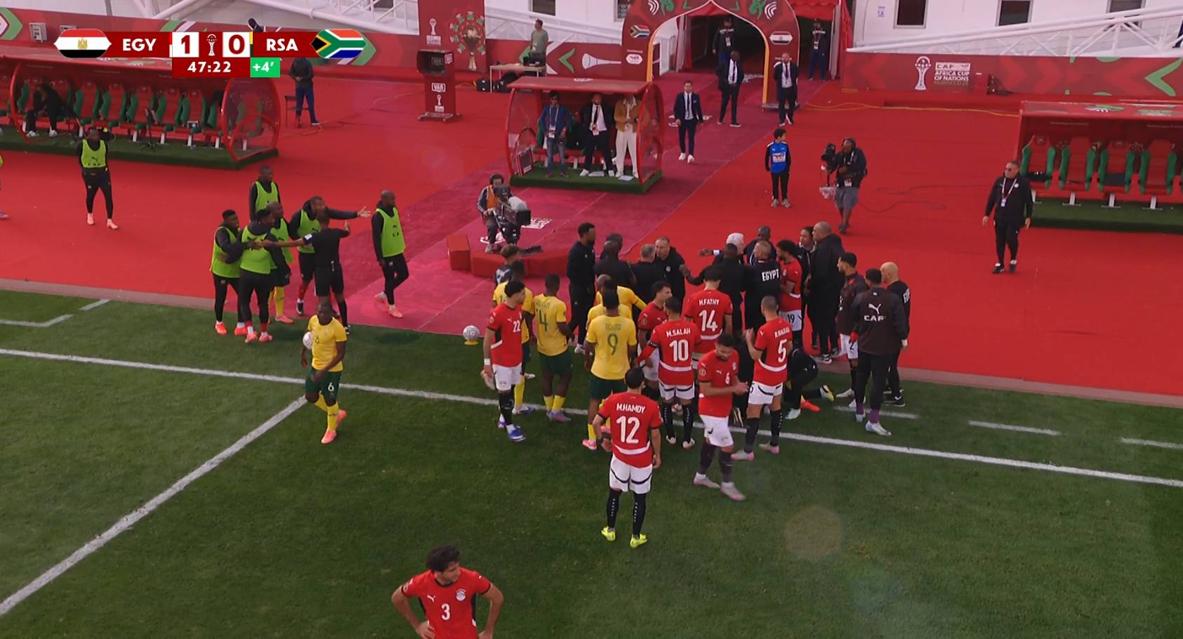 مرت 75 دقيقة من مواجهة منتخب مصر ومنتخب جنوب إفريقيا وتشير النتيجة إلى تقدم الفراعنة بنتيجة 1-0، على ملعب أدرار بمدينة أغادير المغربية في الجولة الثانية بالمجموعة الثانية في النسخة رقم 35 لكأس الأمم الأفريقية.