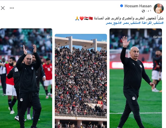 وكتب حسام حسن، عبر صفحته بموقع التواصل الاجتماعي “فيس بوك”: "شكرا للجمهور المغربي والمصري والعربي على المساندة".