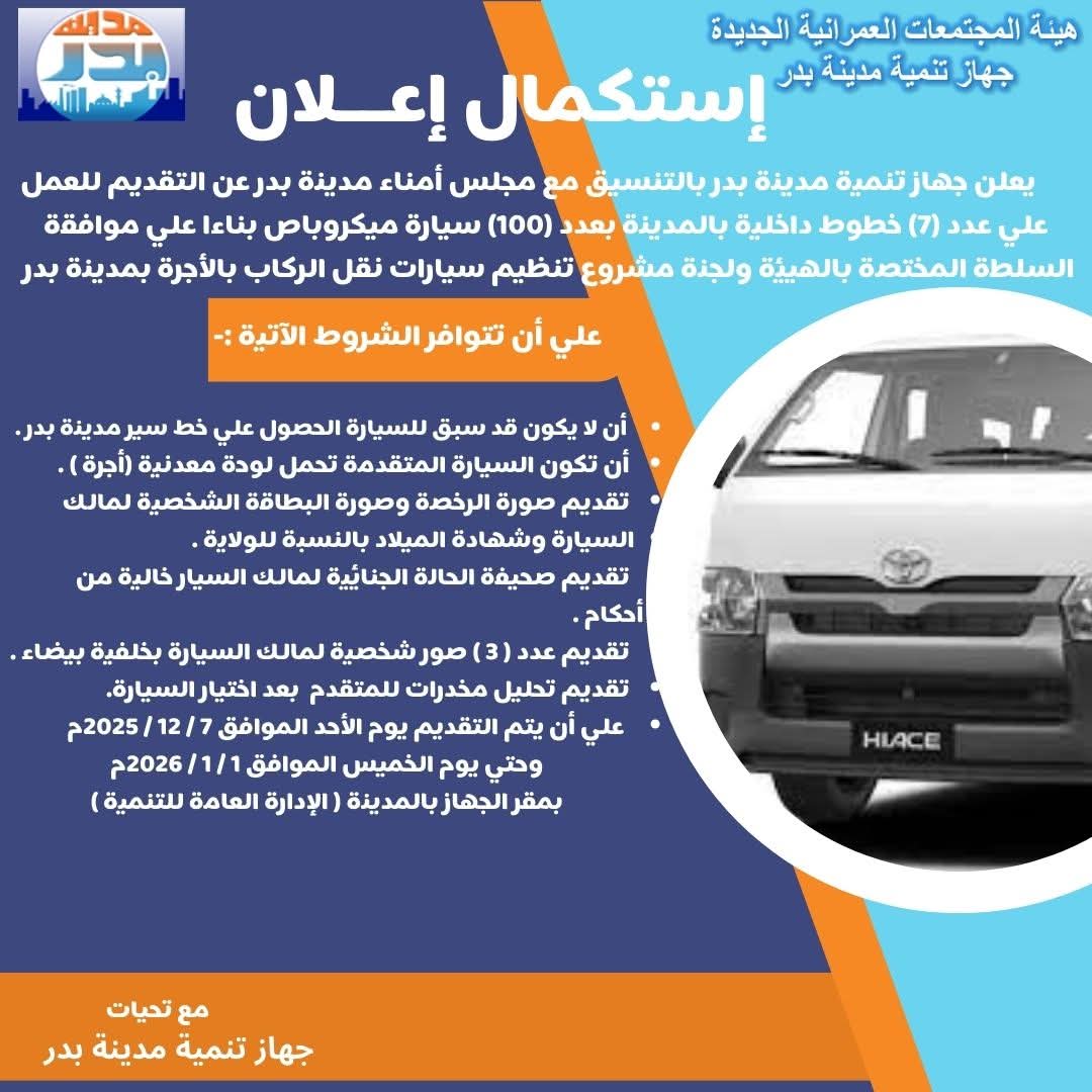 أعلن جهاز تنمية مدينة بدر، بالتنسيق مع مجلس أمناء المدينة، استكمال إجراءات التقديم للعمل على 7 خطوط داخلية لتشغيل عدد 100 سيارة ميكروباص.