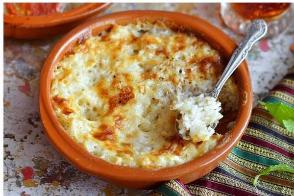 ـ يُخلط الحليب مع شوربة اللحمة ويُضاف الخليط إلى الطاجن حتى يغطي الأرز.