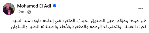 وكتب العدل عبر حسابه الشخصي بموقع التواصل الاجتماعي فيسبوك: “خبر مزعج ومؤلم رحيل الصديق المبدع.. المتفرد فى إبداعه داوود عبد السيد، نعزى انفسنا.. ونتمنى له الرحمة والمغفرة ولأهله وأصدقائه الصبر والسلوان”.