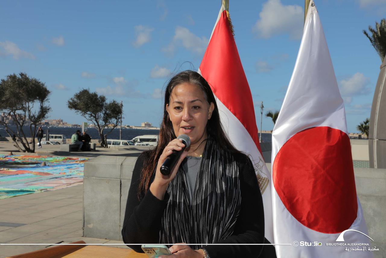 تلت ذلك كلمة السيدة يوكو كوارا (Yuko Kawahara)، رئيسة مشروع "Earth Identity"، والتي عبرت فيها عن فخرها بوصول اللوحة لمحطتها الأخيرة بالإسكندرية، مشيدة بمشاركة أطفال مدينة "ساكاي" اليابانية بلوحة مشابهة جرى عرضها بجوار الأهرامات، وموجهة الشكر لكافة المتطوعين والقائمين على إنجاح هذا العمل الذي يهدف لمخاطبة العالم بلغة الفن والسلام، كما رحبت بالأطفال المشاركين داعية إياهم للاستمتاع بالعروض الثقافية اليابانية المصاحبة للحفل.