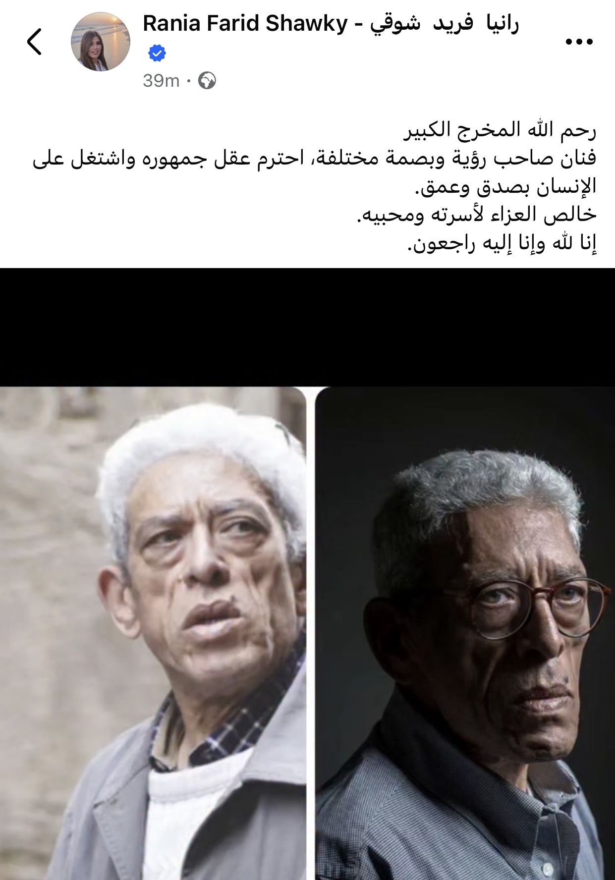 وكتبت رانيا فريد شوقي عبر حسابها الشخصي بموقع فيسبوك: “رحم اللّٰه المخرج الكبير فنان صاحب رؤية وبصمة مختلفة، احترم عقل جمهوره واشتغل على الإنسان بصدق وعمق، خالص العزاء لأسرته ومحبيه، إنا للّه وإنا إليه راجعون”.