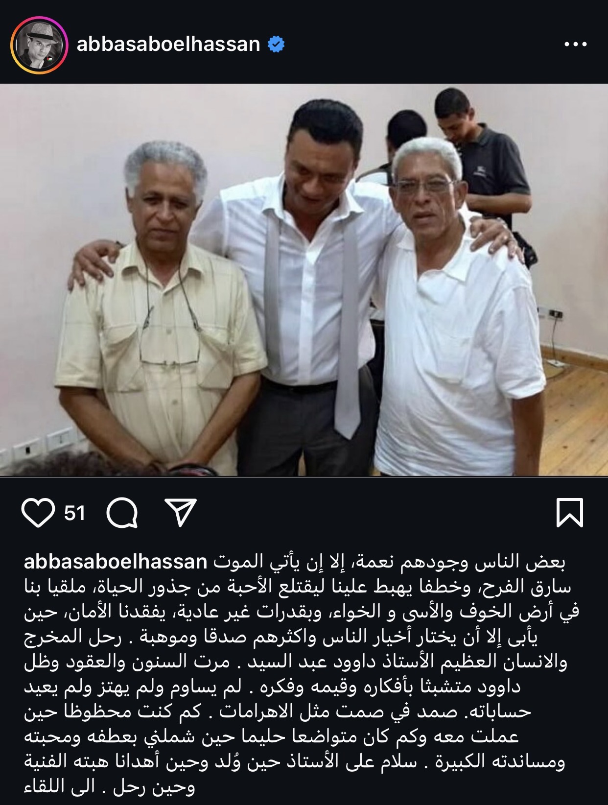 نعى الفنان عباس ابوالحسن، المخرج داود عبد السيد الذي توفي اليوم السبت، عن عمر ناهز 79 عاما.