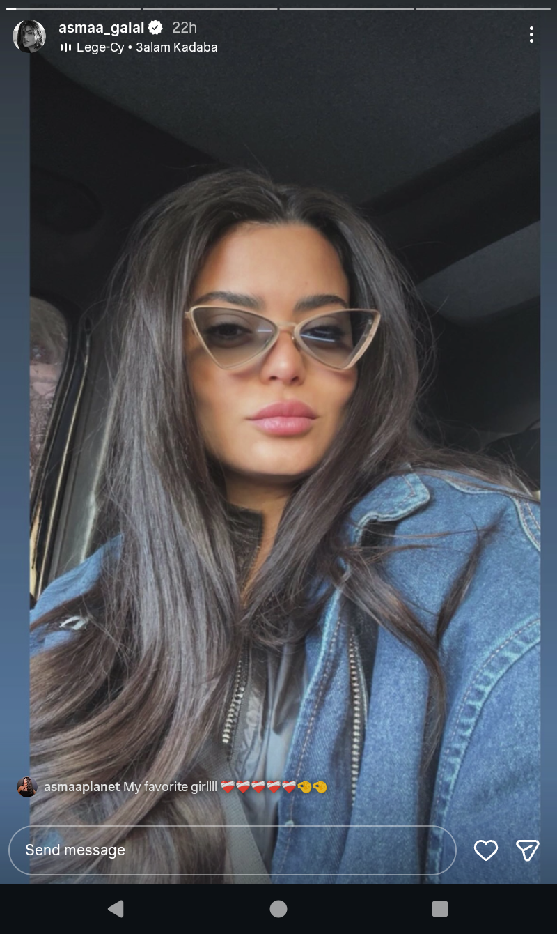 وظهرت أسماء جلال في الصورة من داخل سيارتها، بإطلالة جذابة نالت إعجاب متابعيها.