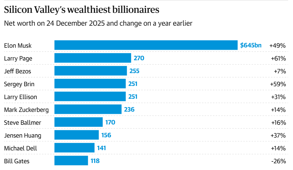 ويحتفظ إيلون ماسك بموقع الصدارة بين كبار المليارديرات، متفوقا على لاري بيج، مؤسس "جوجل"، وجيف بيزوس، مؤسس "أمازون"، اللذين ارتفعت ثرواتهما إلى 270 مليار دولار و255 مليار دولار على التوالي.