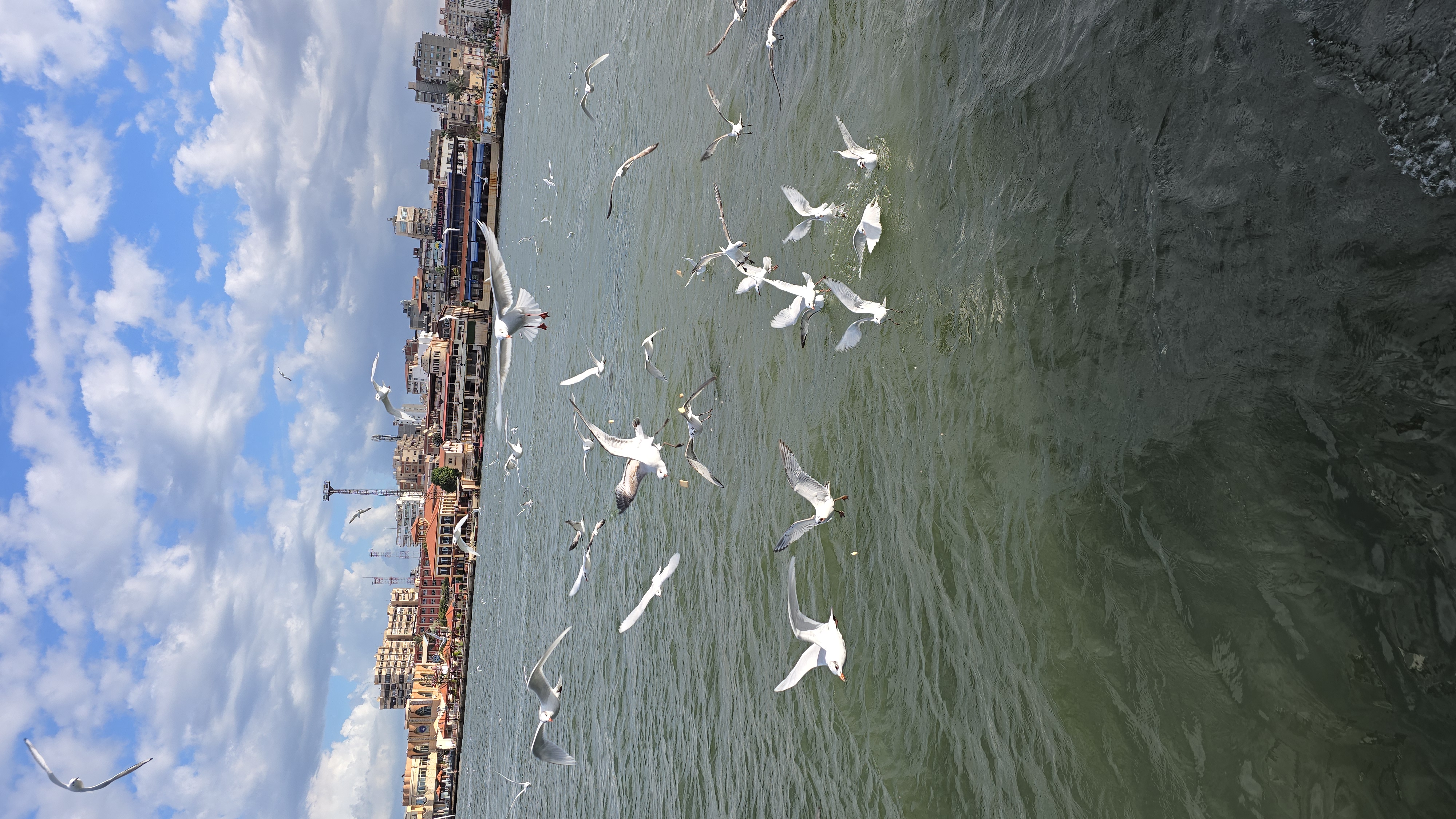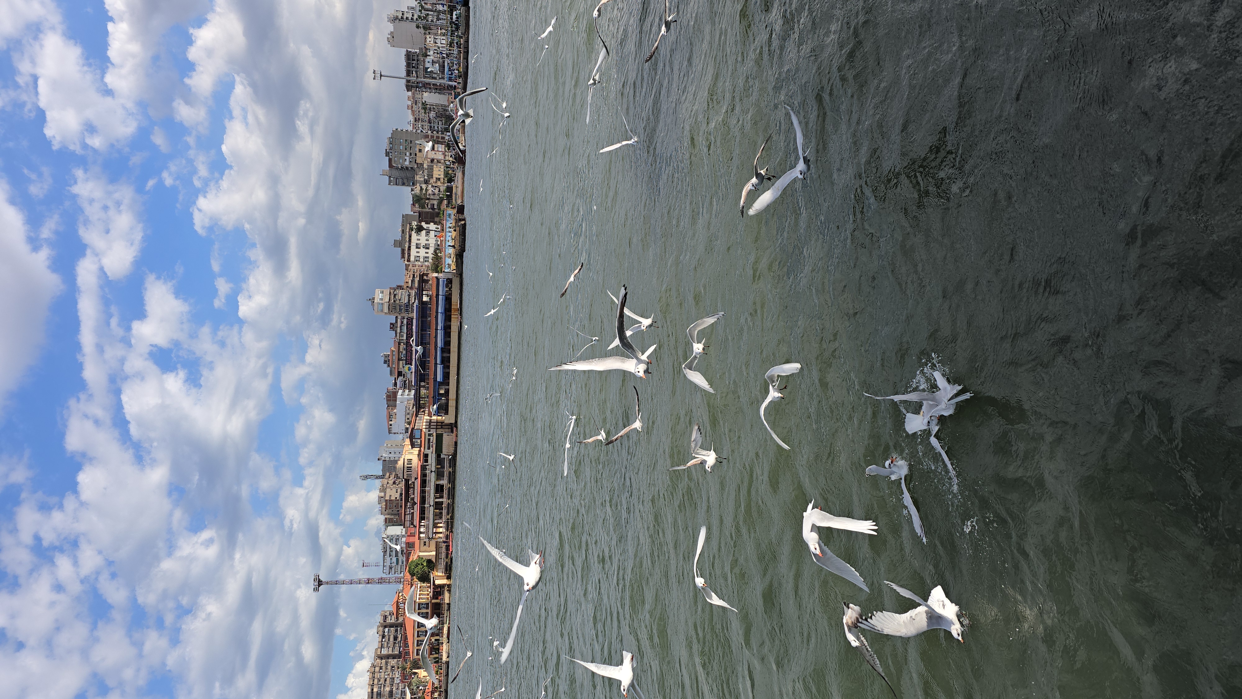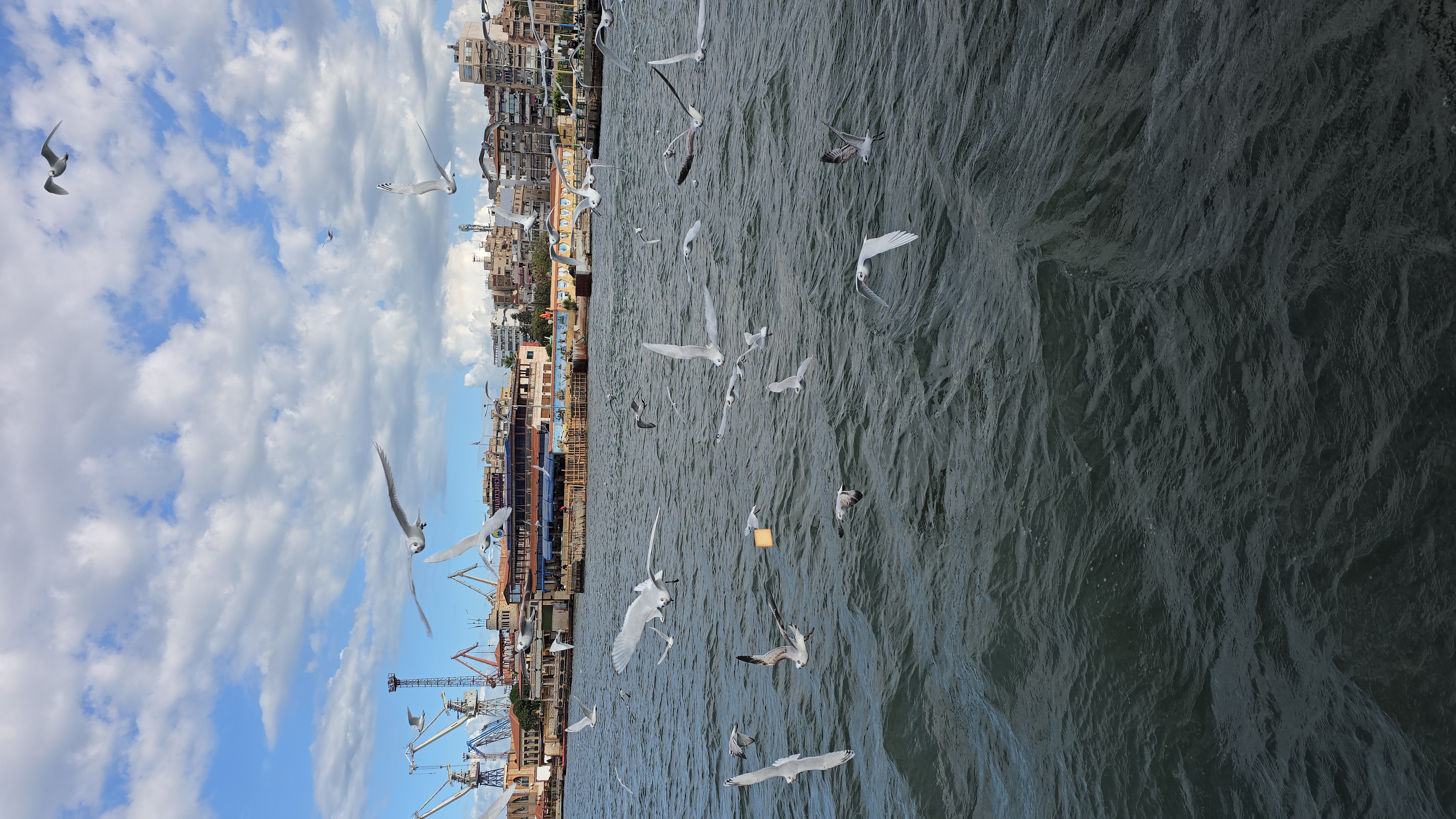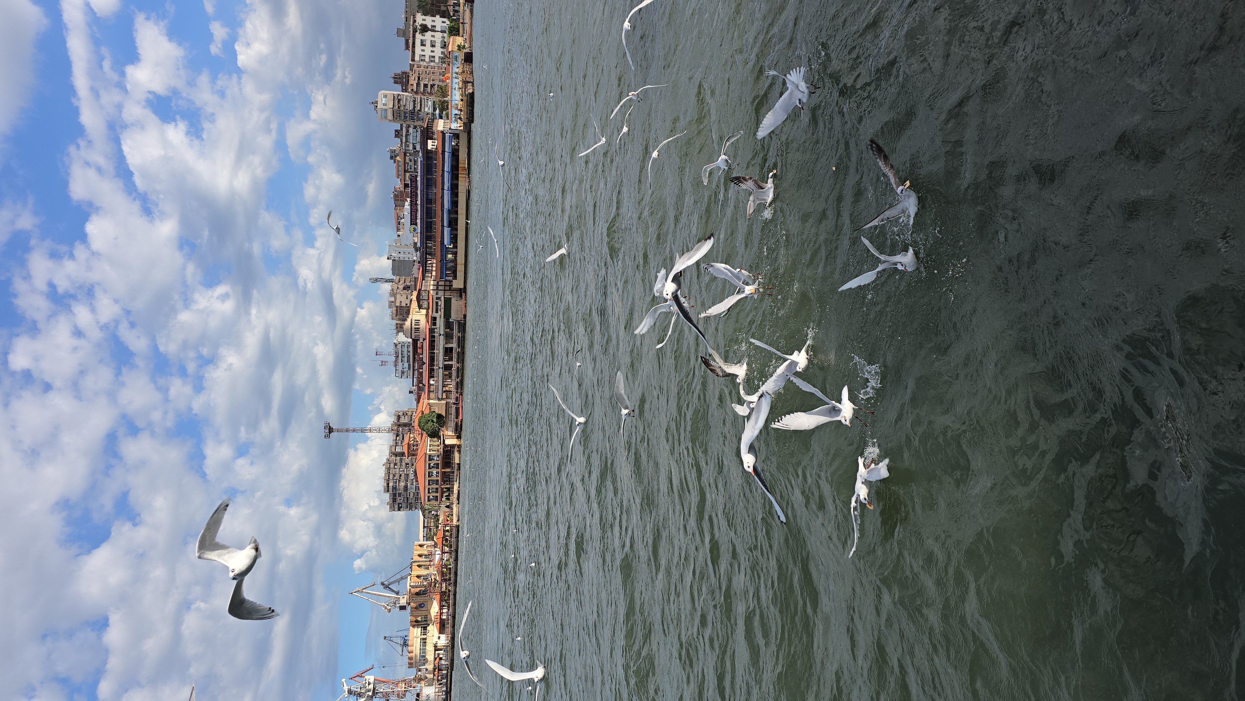 وبدأ الأطفال يلقون بقطع الخبز فى الماء أثناء تحرك المعديات بين ضفتي القناة مما تسبب فى تجمع طيور النورس عليها لالتقاط طعامهم من سطح المياه لحظة سقوط الخبر عليها