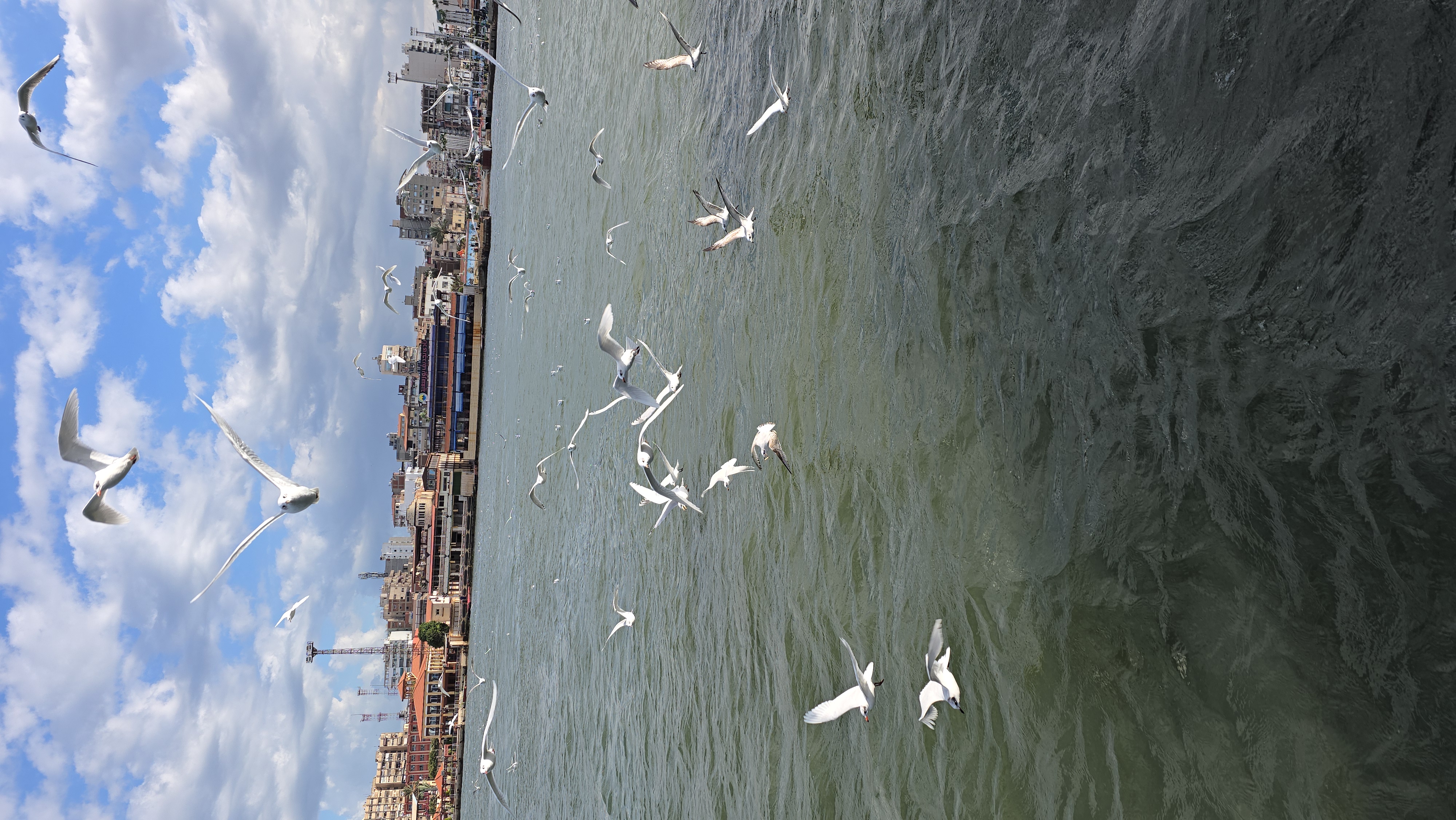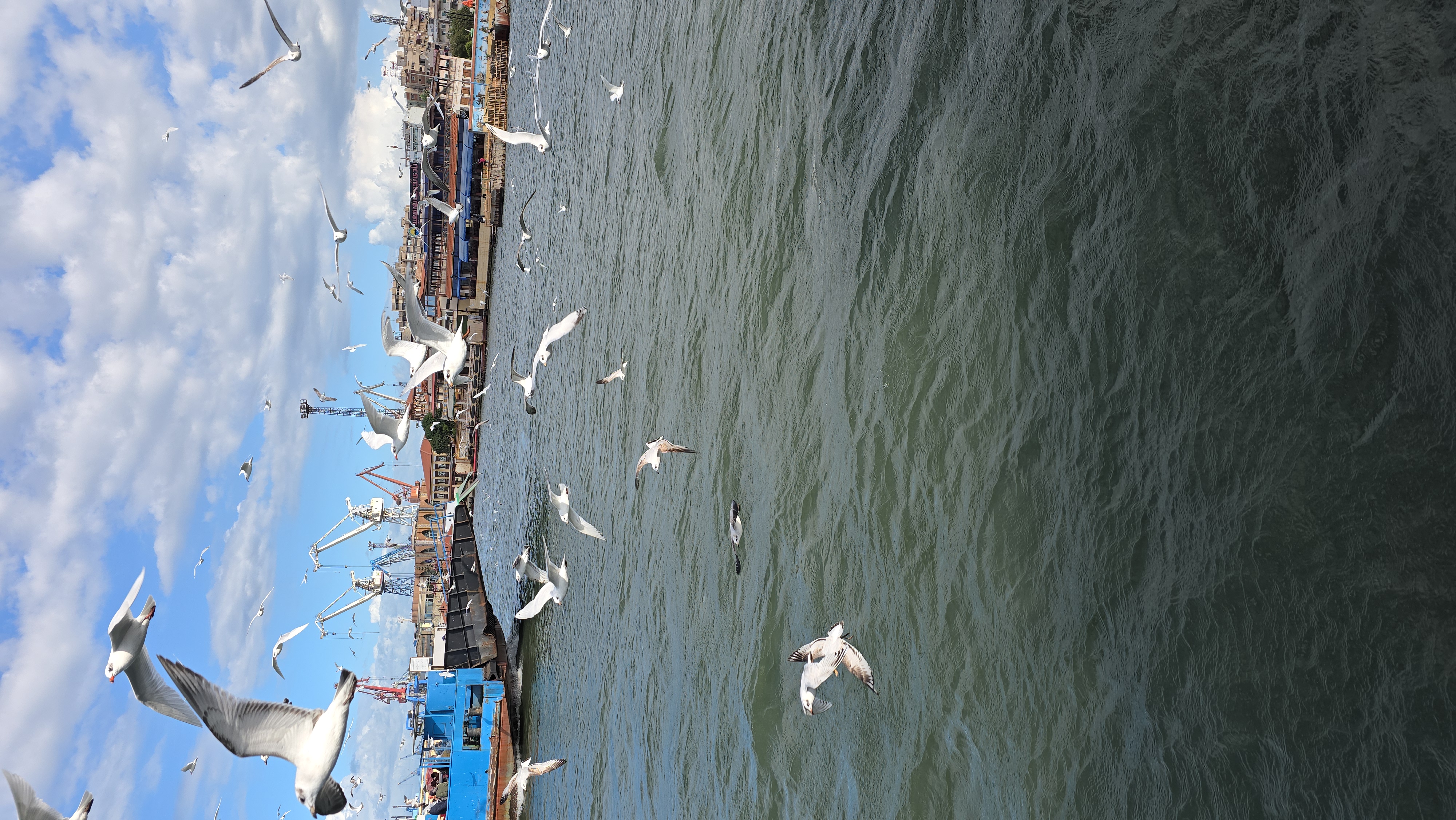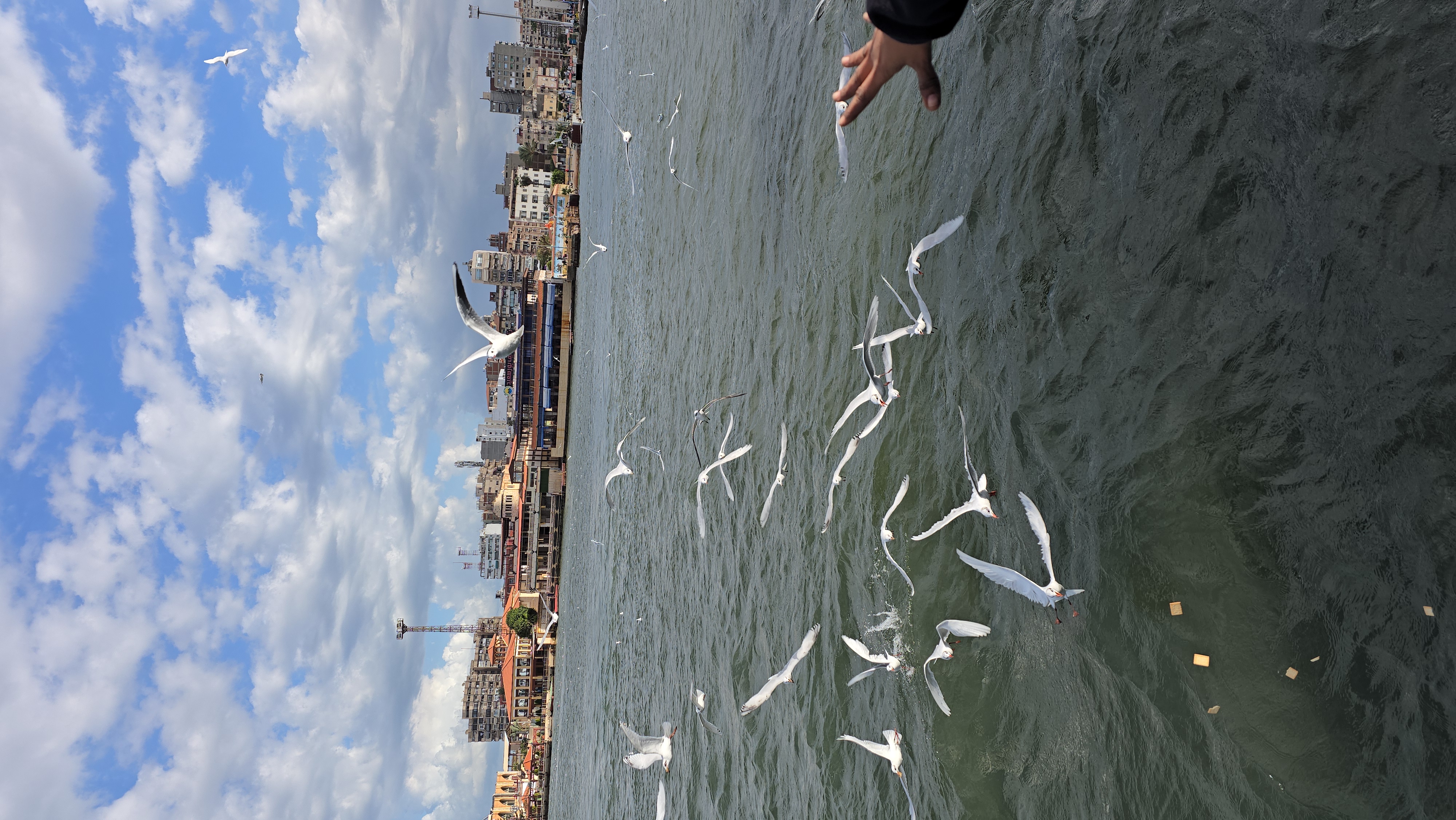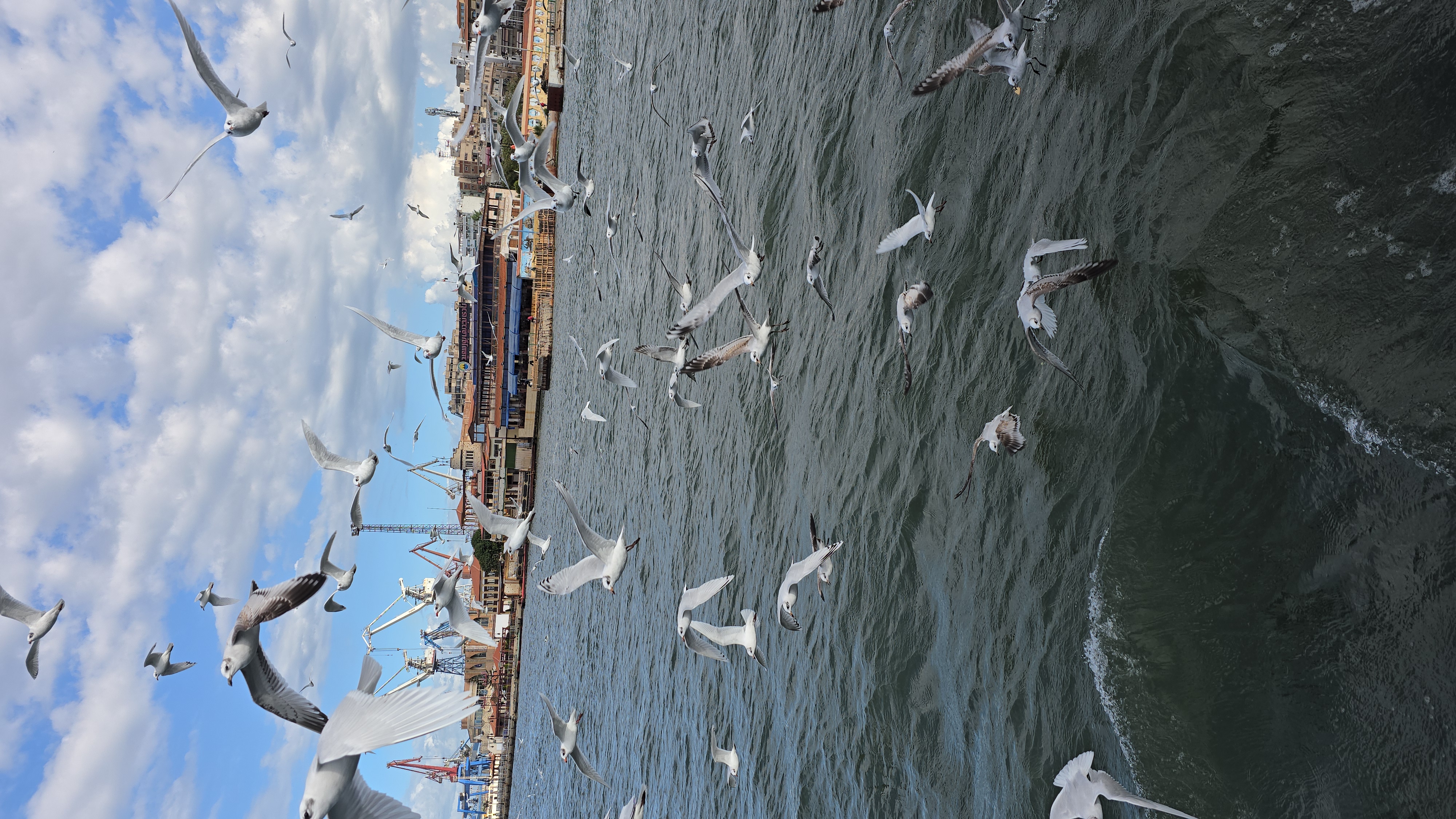 وبدأ الأطفال يلقون بقطع الخبز فى الماء أثناء تحرك المعديات بين ضفتي القناة مما تسبب فى تجمع طيور النورس عليها لالتقاط طعامهم من سطح المياه لحظة سقوط الخبر عليها