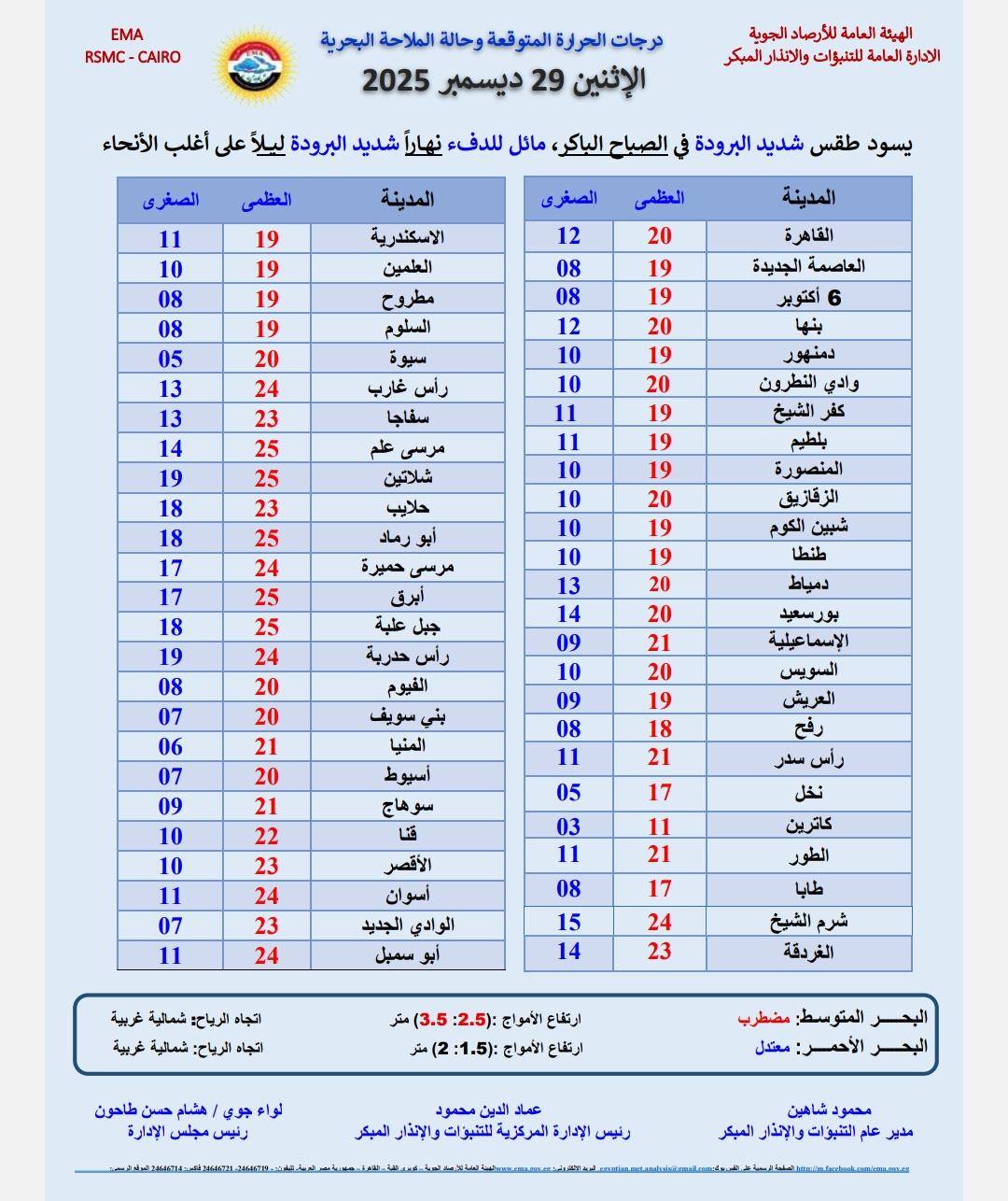 وفيما يلي بيان بدرجات الحرارة المتوقعة غدا على محافظات ومدن مصر: