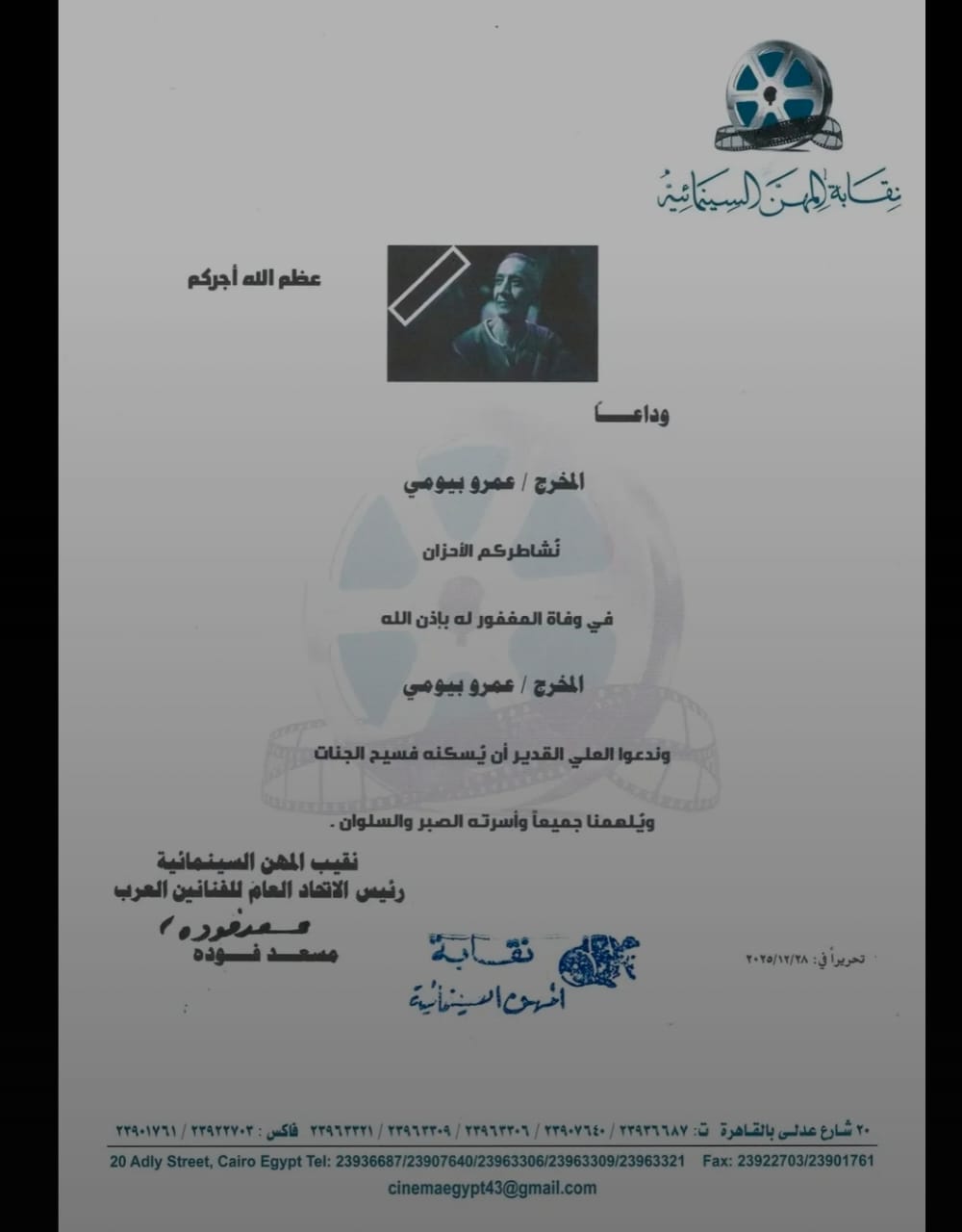 ونشر الحساب الرسمى لنقابة المهن السينمائية منشور عبر فيسبوك ، جاء فيه: "المغفور له بإذن الله الزميل المخرج/ عمرو بيومي .. يوم الثلاثاء الموافق 30/12/2025 بقاعة مناسبات مسجد الرحمة - شارع محمد صبري أبو علم - باب اللوق - وسط البلد بعد صلاة المغرب من الساعة الخامسة والنصف مساءً وحتى الساعة العاشرة مساءً .. تغمد الله الفقيد بواسع رحمته
