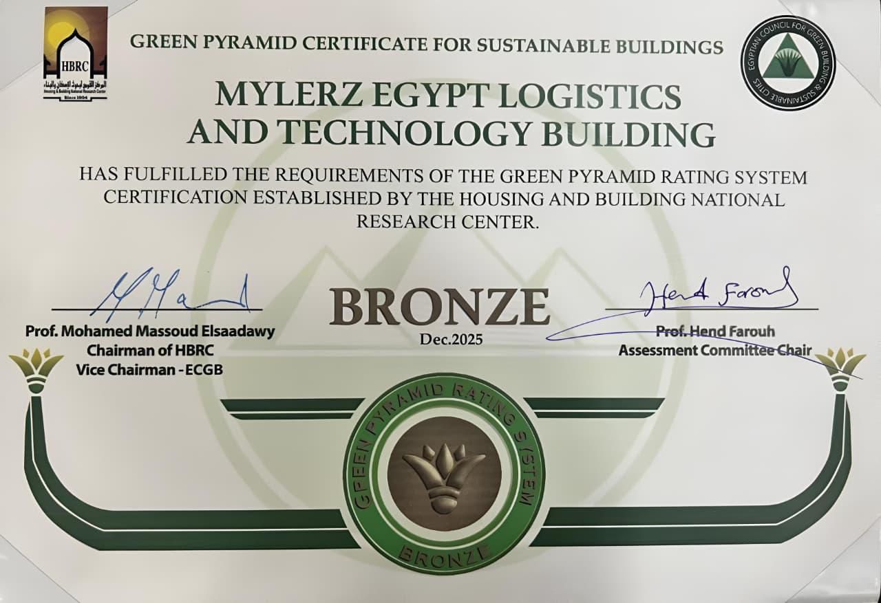 منح المركز القومي لبحوث الإسكان والبناء، التابع لوزارة الإسكان، شهادة الهرم الأخضر – المستوى البرونزي إلى شركة مايلرز للخدمات اللوجستية والتكنولوجية بأبوراش، كأحد المشروعات التي تطبق معايير واشتراطات الاستراتيجية الوطنية للعمران والبناء الأخضر في مصر.