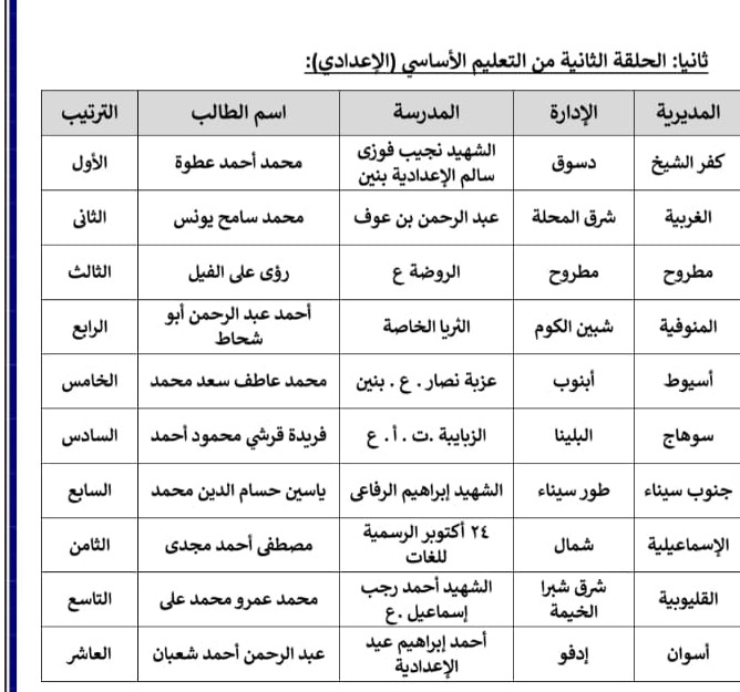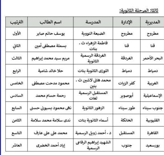 وأعلن عادل عتلم ، مدير مديرية التربية والتعليم بجنوب سيناء، حصول الطالبة نهى محمود بسيوني، بمدرسة الزهور الثانوية بنات بمدينة طور سيناء، على المركز السابع على مستوى الجمهورية للمرحلة الثانوية، كما حصل الطالب ياسين حسام الدين محمد، بمدرسة الشهيد إبراهيم الرفاعي الإعدادية التابعة لإدارة طور سيناء التعليمية، على المركز السابع على مستوى الجمهورية للمرحلة الإعدادية في المسابقة نفسها.