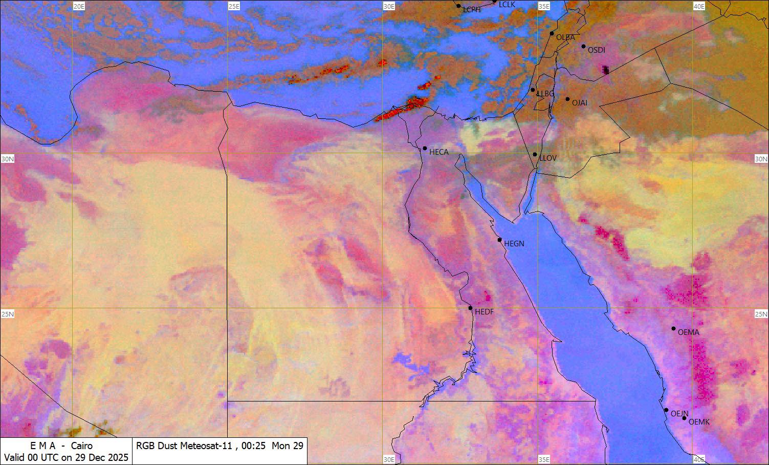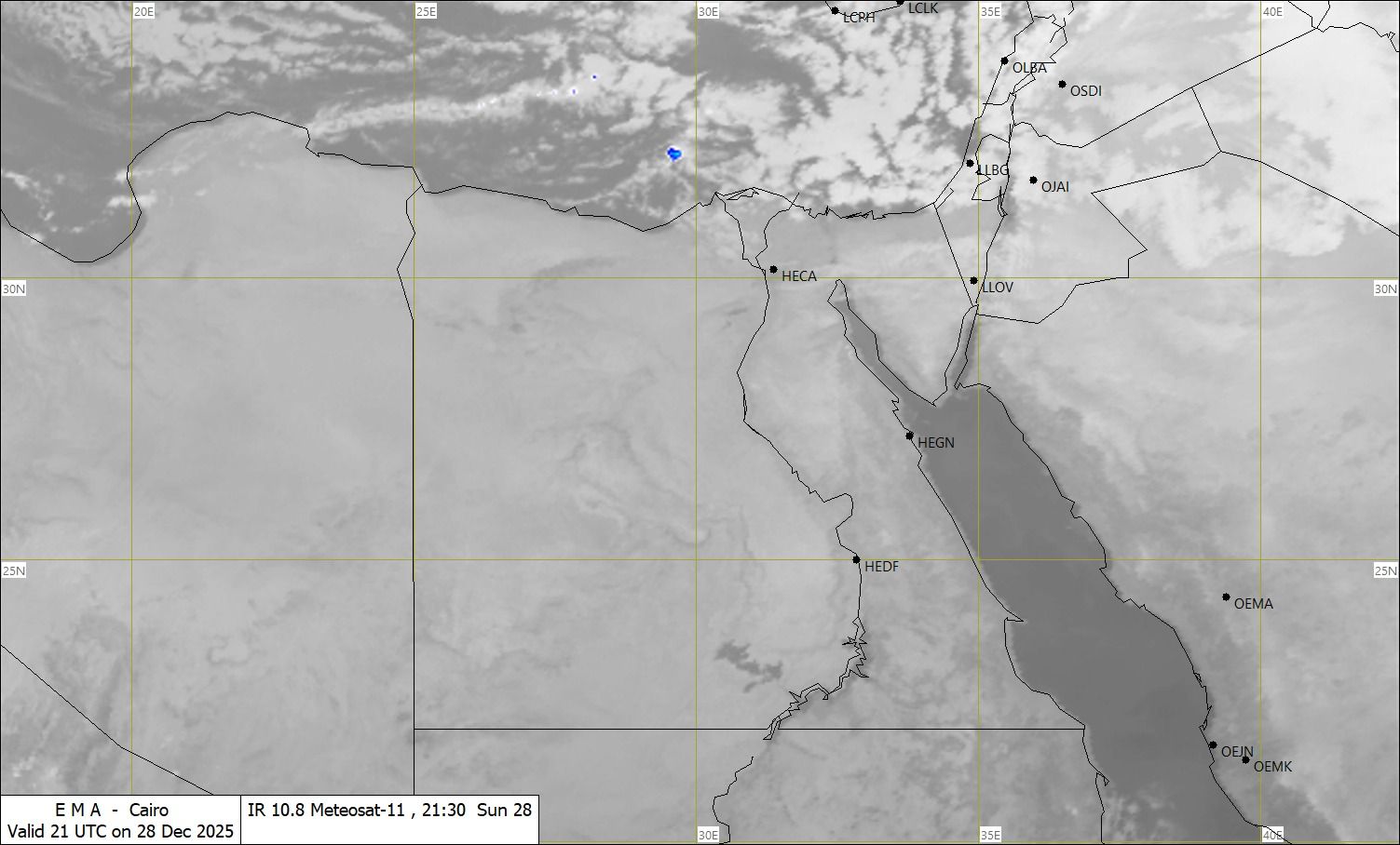 قبيل فترة الظهيرة، رصدت صور الأقمار الصناعية استمرار السحب الرعدية الممطرة على محافظة الأسكندرية وشمال الوجه البحرى (البحيرة- كفر الشيخ -دمياط-الدقهلية)، يصاحبها سقوط أمطار متوسطة تغزر أحيانا.