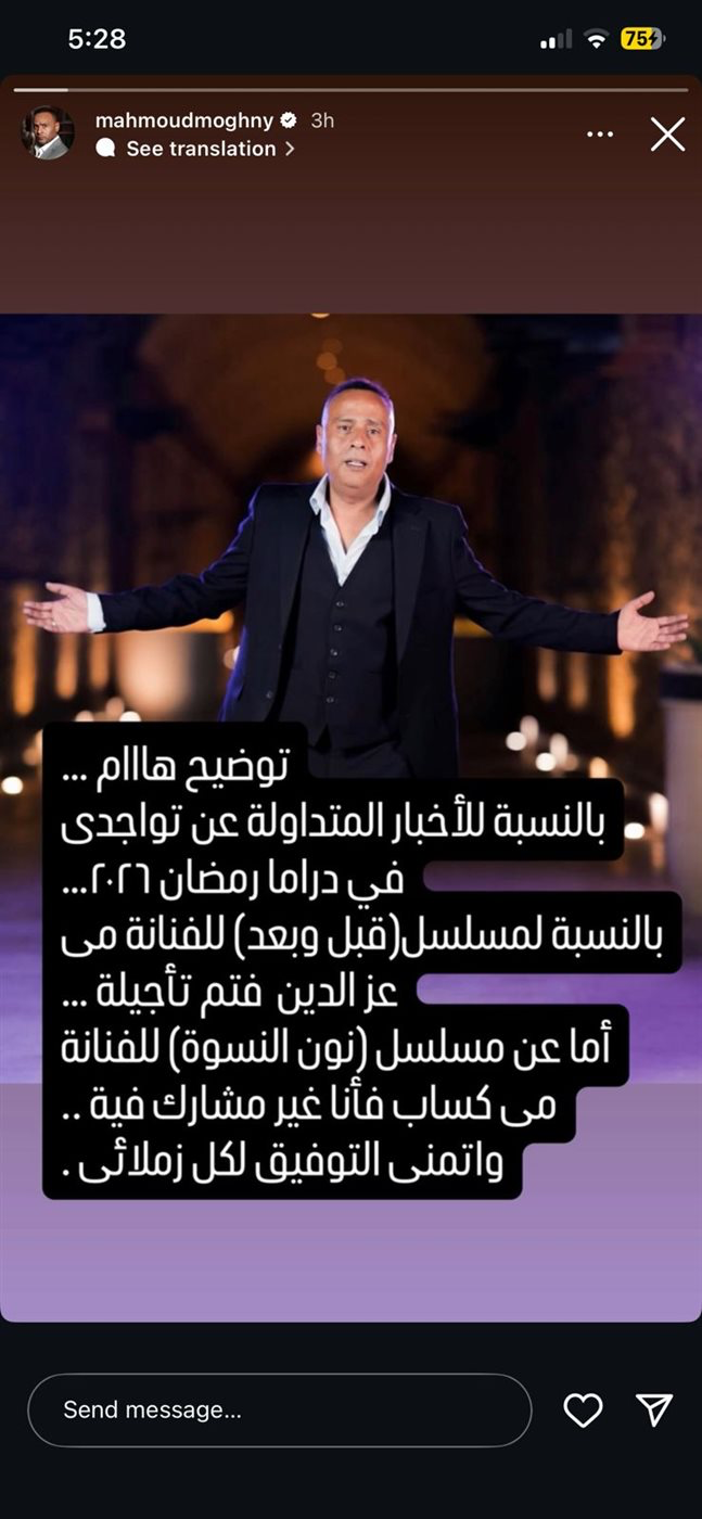 وكتب محمود عبدالمغني عبر خاصية الاستوري انسجرام : "توضيح هام بالنسبة للأخبار المتداولة عن تواجدى في دراما رمضان 2026، بالنسبة لـ مسلسل قبل وبعد للفنانة مى عز الدين فتم تأجيله، أما عن مسلسل نون النسوة للفنانة مى كساب فأنا غير مشارك فيه واتمنى التوفيق لكل زملائى".