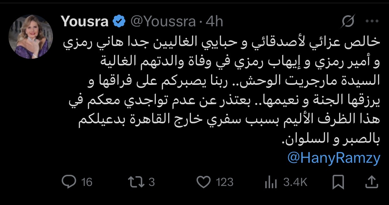 وكتبت يسرا عبر حسابها الشخصي على منصة إكس: “خالص عزائي لأصدقائي و حبايبي الغاليين جدا هاني رمزي و أمير رمزي و إيهاب رمزي في وفاة والدتهم الغالية السيدة مارجريت الوحش.. ربنا يصبركم على فراقها و يرزقها الجنة و نعيمها.. بعتذر عن عدم تواجدي معكم في هذا الظرف الأليم بسبب سفري خارج القاهرة بدعيلكم بالصبر و السلوان”.