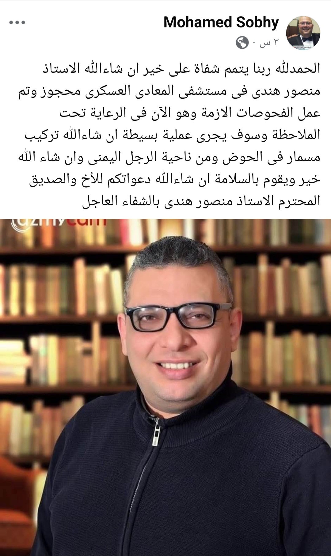 وقد نشر محمد صبحي عضو مجلس نقابة الموسيقيين عبر صفحته الرسمية بموقع التواصل الاجتماعى فيسبوك قائلا: الحمد لله ربنا يتمم شفاه على خير.. إن شاء الله منصور هندى فى المستشفى محجوز، وتم عمل الفحوصات اللازمة.. وهو الآن فى الرعاية تحت الملاحظة، وسوف يجرى عملية بسيطة إن شاء الله تركيب مسمار فى الحوض، ومن ناحية الرجل اليمنى وإن شاء الله خير، ويقوم بالسلامة ان شاء الله دعواتكم للأخ والصديق المحترم الاستاذ منصور هندى بالشفاء العاجل.