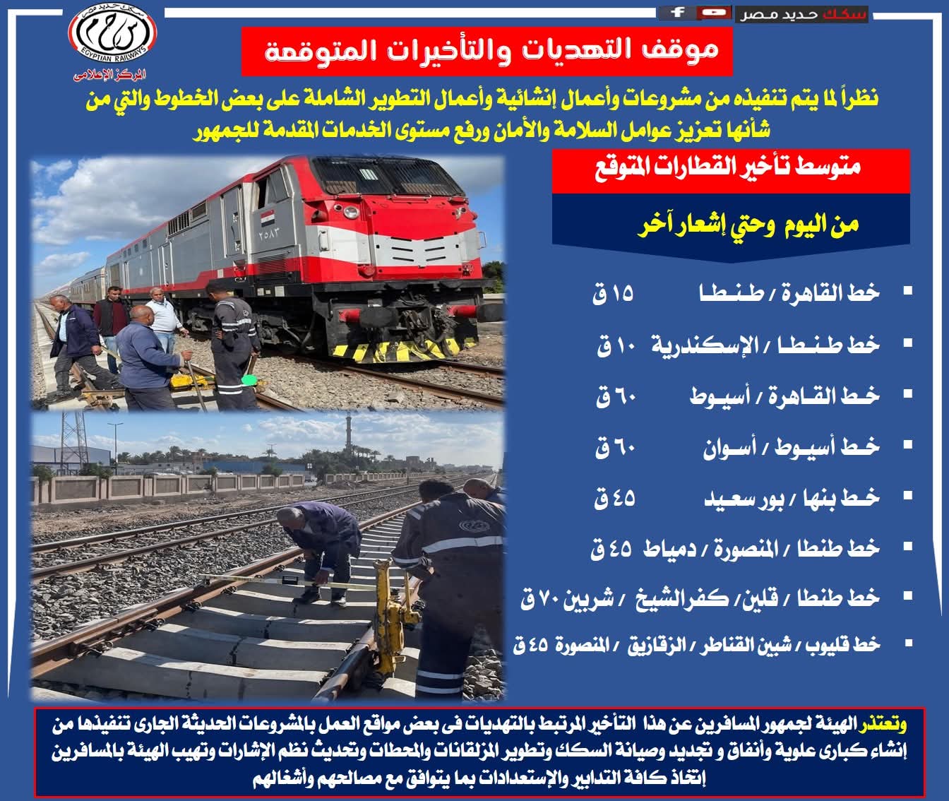 أعلنت الهيئة القومية لسكك حديد مصر عن موقف التهديات والتأخيرات المتوقعة لبعض خطوط القطارات، وذلك نظراً لما يتم تنفيذه من مشروعات تطوير شاملة تهدف لتعزيز عوامل السلامة والأمان ورفع مستوى الخدمة المقدمة للجمهور.