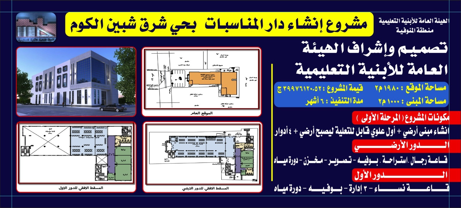 وتفقد محافظ المنوفية الموقع العام لقطعة الأرض المخصصة للمشروع خلف شركة مياه الشرب، واستمع الى شرح تفصيلي من مدير عام هيئة الأبنية التعليمية عن تفاصيل المشروع والذى يضم أرضى وأول علوى قابل للتعلية ، حيث يضم " قاعات رجال وسيدات ودورات مياه وبوفيه وغرف إدارية" ، موجهاً هيئة الأبنية التعليمية بسرعة البدء في تنفيذ الأعمال الانشائية الأسبوع القادم ، والمتابعة المستمرة للأعمال المنفذة والتواصل مع الشركة المنفذة وتذليل العقبات لضمان سرعة الانتهاء منه وفق البرنامج الزمنى المقرر ، بما يعود بالنفع العام وخدمة الأهالي ويحقق رضاهم.
