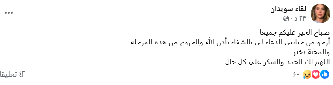 وكتبت لقاء سويدان، عبر صفحتها على موقع التواصل الاجتماعي “فيسبوك”: "أرجو من حبايبي الدعاء لي بالشفاء بإذن الله والخروج من هذه المرحلة والمحنة بخير، اللهم لك الحمد والشكر على كل حال".