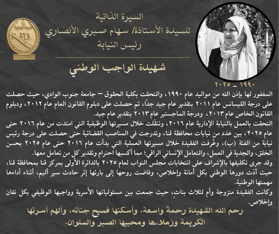 نشرت هيئة النيابة الإدارية، السيرة الذاتية للمستشارة سهام صبري الأنصاري، شهيدة الواجب الوطني، التى لقيت مصرعها عقب انتهاء إشرافها على انتخابات مجلس النواب فى حادث بمحافظة قنا.