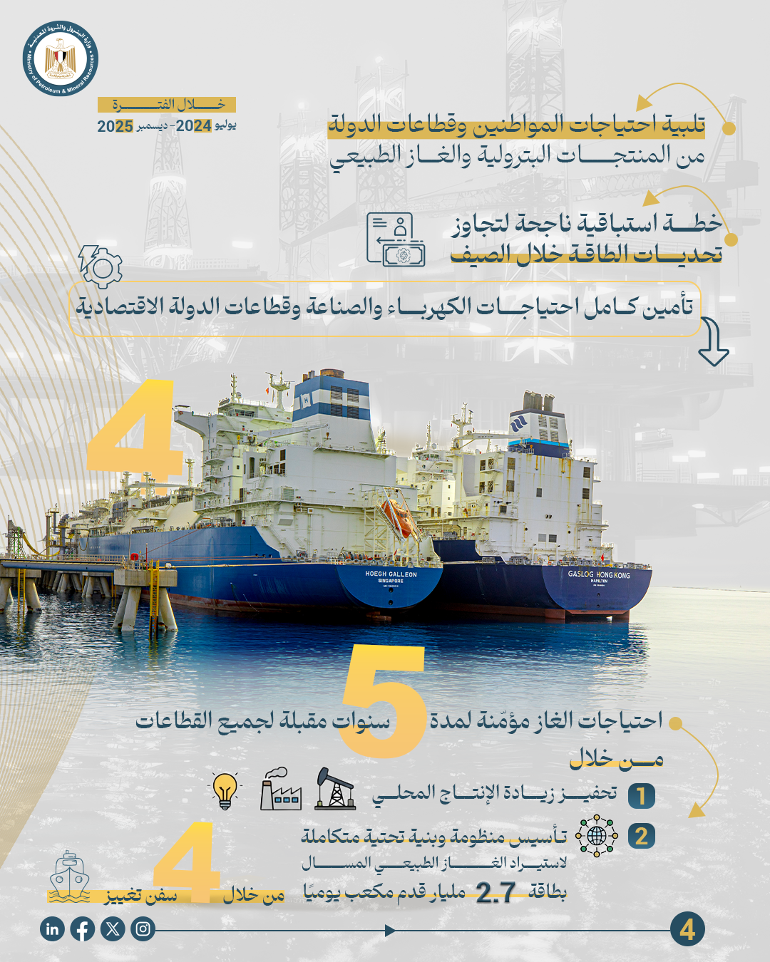 • عودة مصر إلى تصدير عدد من شحنات الغاز الطبيعي المسال في عام 2025 وذلك لتحقيق قيمة مضافة ومردود اقتصادي متمثل في تعظيم الاستفادة الاقتصادية من مجمعات الغاز المسال والدور المصري كمركز إقليمي لتداول وتجارة الغاز فضلاً عن تحفيز الشركاء الأجانب على ضخ الاستثمار اللازم لزيادة انتاج الغاز.