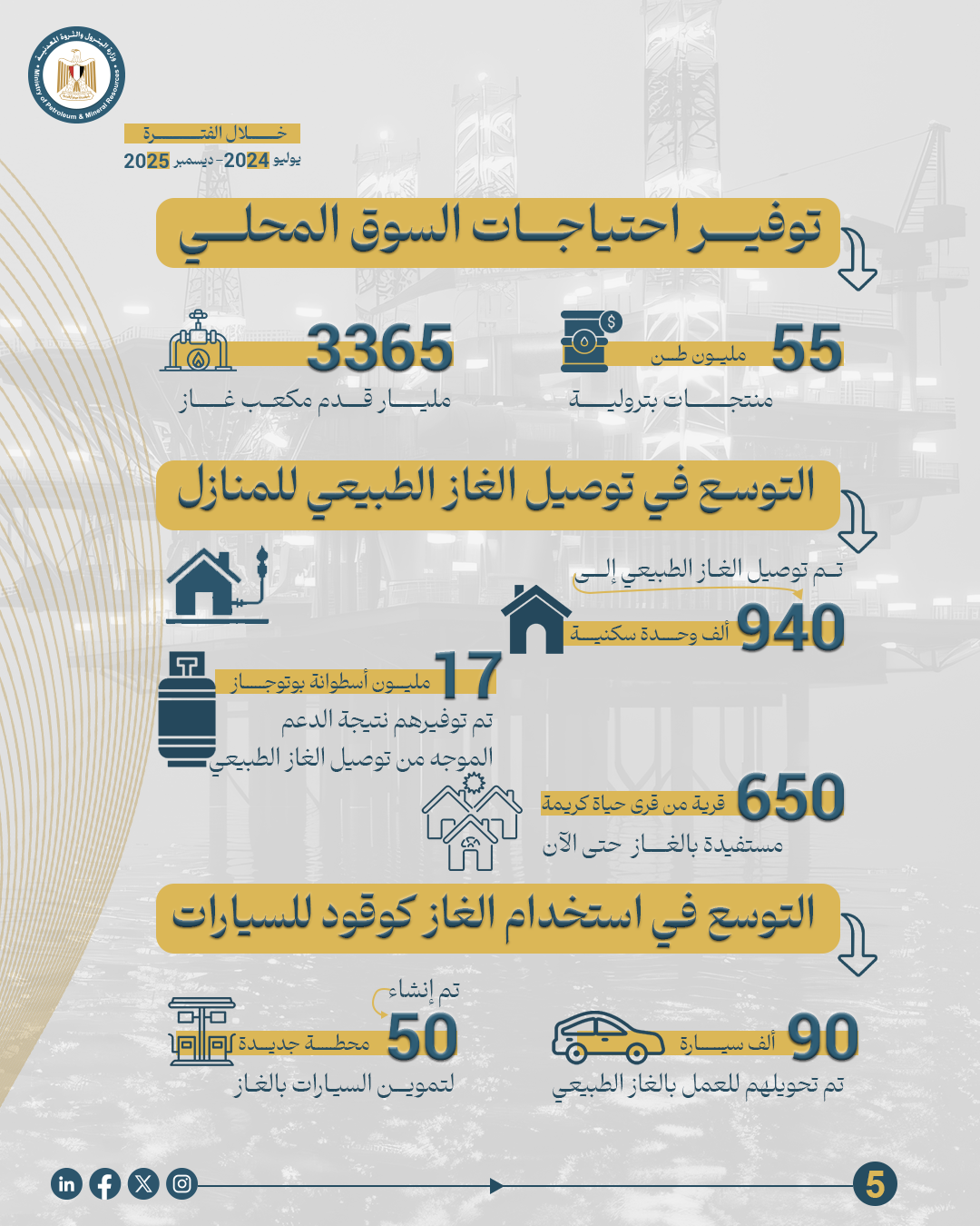 • توفير 55 مليون طن من المنتجات البترولية للاستهلاك المحلى و 3356 مليار قدم مكعب غاز ، كمالتم توصيل الغاز الطبيعى الى 940 الف وحدة سكنية مما ساهم في توفير 17 مليون اسطوانة بوتاجاز والدعم الموجه لها ، وبلغ عدد قرى حياة كريمة المستفيدة بالغاز الطبيعى اكثر من 650 قرية حتى الآن ، كما تم تحويل 90 الف سيارة للعمل بالغاز الطبيعى وانشاء نحو 50 محطة جديدة لتموين السيارات بالغاز.