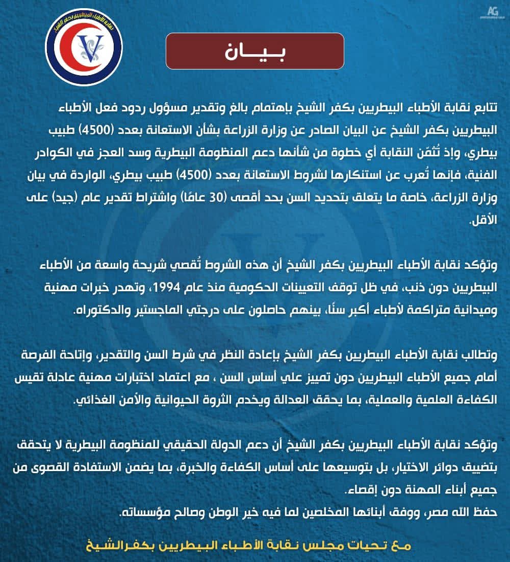 ووسط صمت لافت من النقابة العامة ومجلسها، أعلنت نقابة الأطباء البيطريين بكفر الشيخ، عن تضامنها مع ورفضها لشروط الاستعانة المعلنة، مؤكدة أن هذه الشروط تُقصي شريحة واسعة من الأطباء دون مبرر مهني عادل، رغم الحاجة الملحة لدعم المنظومة البيطرية وسد العجز في الكوادر الفنية.