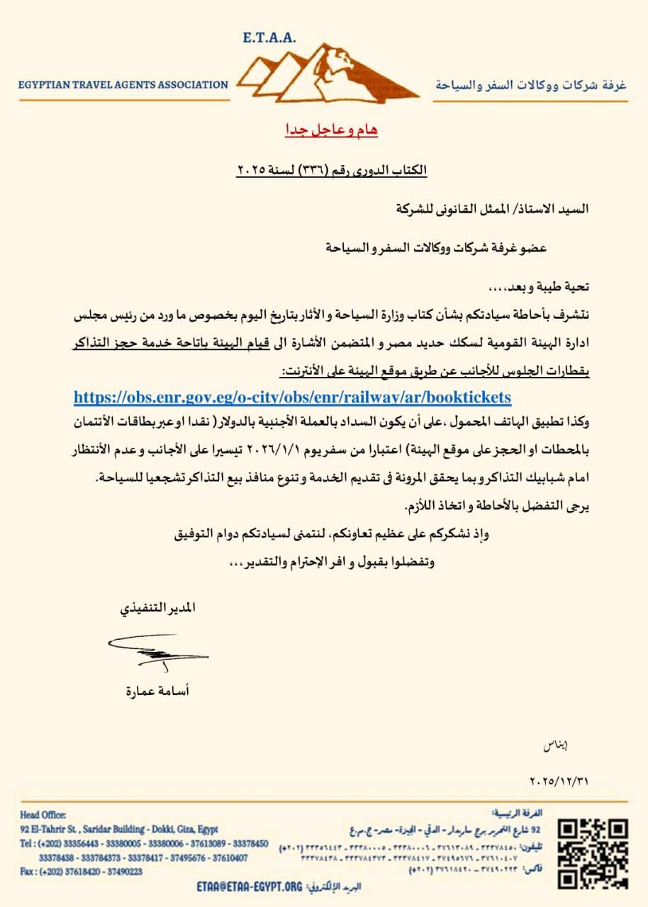 أشارت من سفر يوم 1 يناير 2026 تيسيراً على الأجانب وعدم الإنتظار أمام شبابيك التذاكر وبما يحقق المرونة في تقديم الخدمة وتنوع منافذ بيع التذاكر تشجيعاً للسياحة.