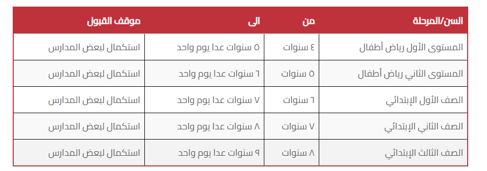 كما أوضحت وزارة التربية والتعليم والتعليم الفني أن سن القبول في الصف الثالث الابتدائي من 8 سنوات حتى 9 سنوات عدا يوم واحد