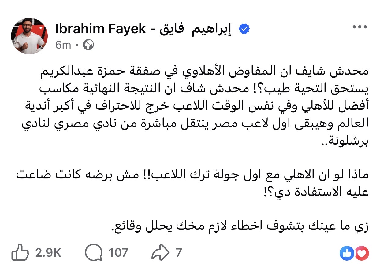وكتب فايق عبر حسابه الشخصي بموقع فيسبوك: “محدش شايف ان المفاوض الأهلاوي في صفقة حمزة عبدالكريم يستحق التحية طيب”.