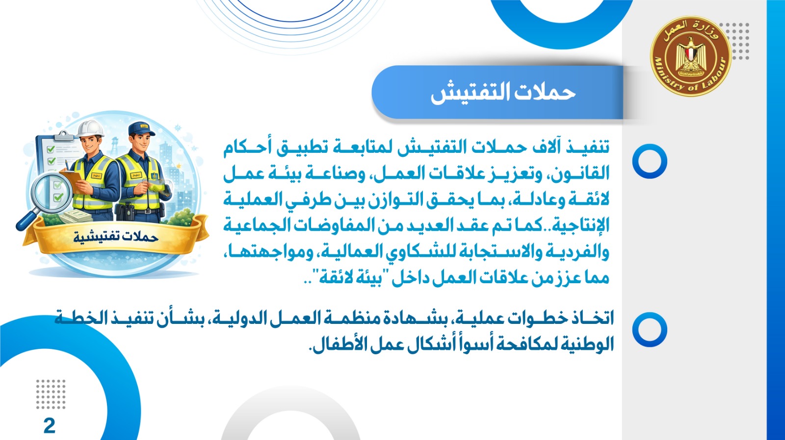 🔴 تنفيذ آلاف حملات التفتيش لمتابعة تطبيق أحكام القانون، وتعزيز علاقات العمل، وصناعة بيئة عمل لائقة وعادلة، بما يحقق التوازن بين طرفي العملية الإنتاجية..كما تم عقد العديد من المفاوضات الجماعية والفردية والاستجابة للشكاوي العمالية، ومواجهتها،مما عزز من علاقات العمل داخل "بيئة لائقة"..