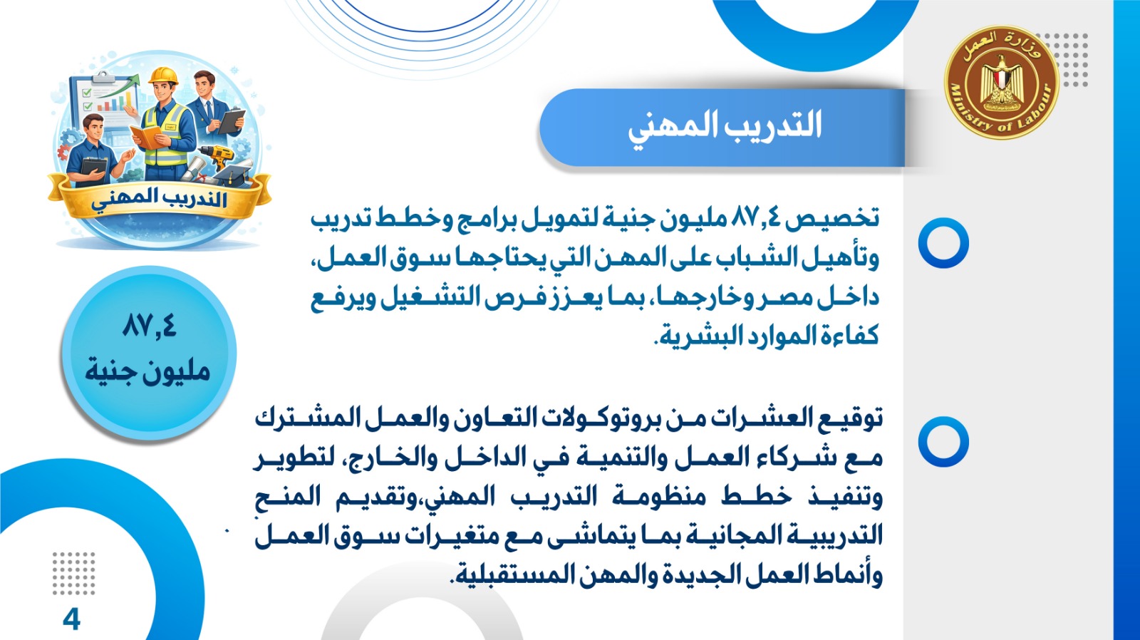 🔴 تخصيص 87.4 مليون جنيه لتمويل برامج وخطط تدريب وتأهيل الشباب على المهن التي يحتاجها سوق العمل، داخل مصر وخارجها، بما يعزز فرص التشغيل ويرفع كفاءة الموارد البشرية.