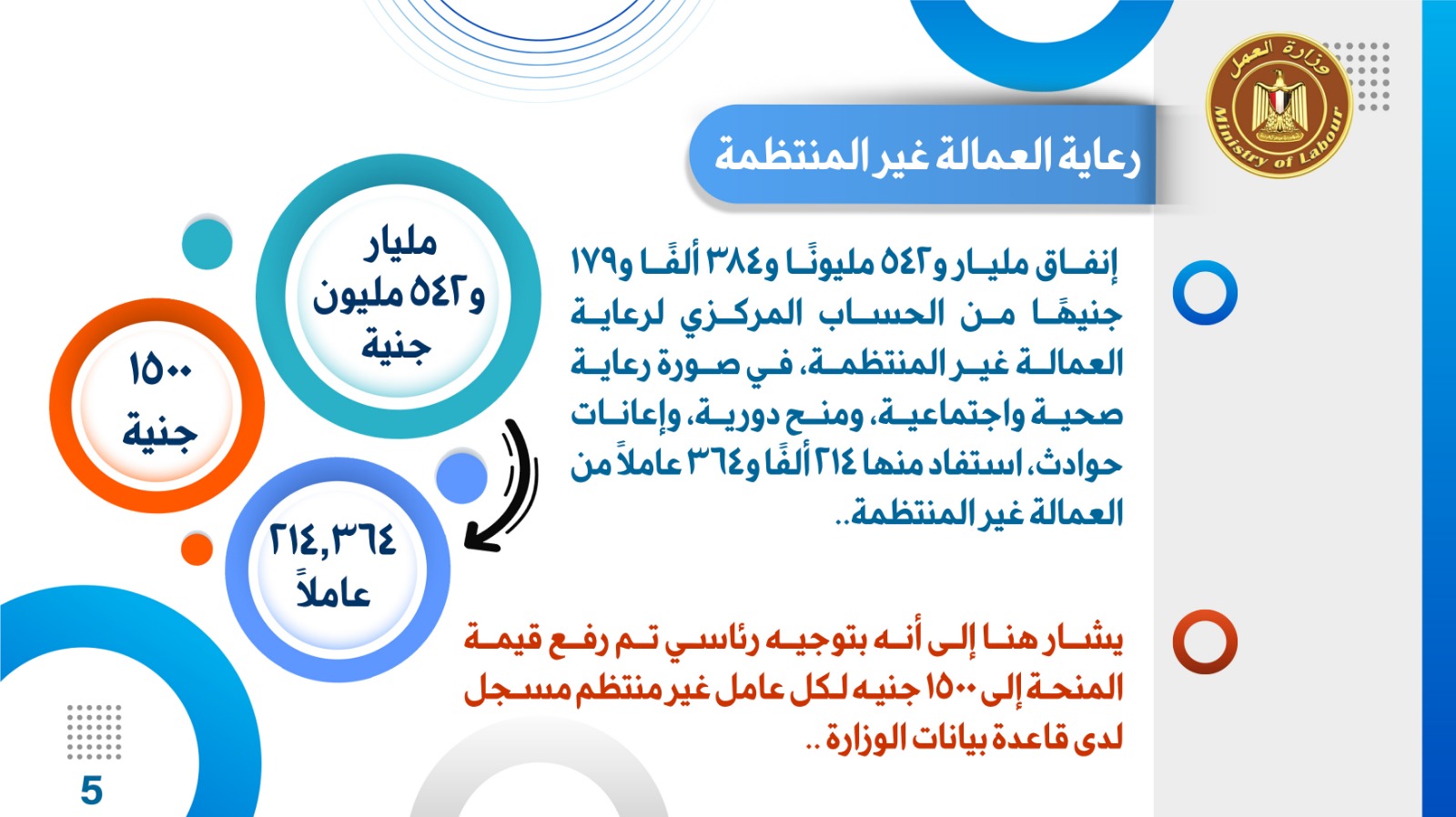 🔴 إنفاق مليار و542 مليونًا و384 ألفًا و179 جنيهًا من الحساب المركزي لرعاية العمالة غير المنتظمة، في صورة رعاية صحية واجتماعية، ومنح دورية، وإعانات حوادث، استفاد منها 214 ألفًا و364 عاملًا من العمالة غير المنتظمة..يشار هنا إلى أنه بتوجيه رئاسي تم رفع قيمة المنحة إلى 1500 جنيه لكل عامل غير منتظم مسجل لدى قاعدة بيانات الوزارة ..