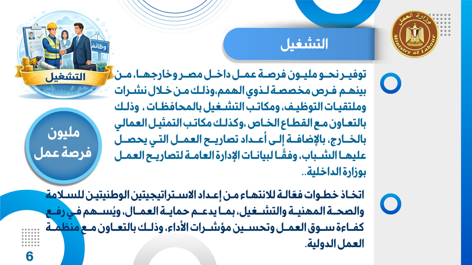 🔴 توفير نحو مليون فرصة عمل داخل مصر وخارجها، من بينهم فرص مخصصة لذوي الهمم..مع العلم بأن الفرص التي وفرتها الوزارة من هذا العدد المذكور، كانت من خلال نشرات وملتقيات التوظيف، ومكاتب التشغيل بالمحافظات، وذلك بالتعاون مع القطاع الخاص ، وكذلك من مكاتب التمثيل العمالي بالخارج..يضاف إليها أعداد " تصاريح العمل" التي يتم استخراجها للشباب بشكل عام لتسهيل إجراءات سفرهم ،وذلك من خلال الإدارة العامة لتصاريح العمل بوزارة الداخلية،وتوثقها وزارة العمل من خلال “وحدة خدمات العمالة المصرية بالخارج”