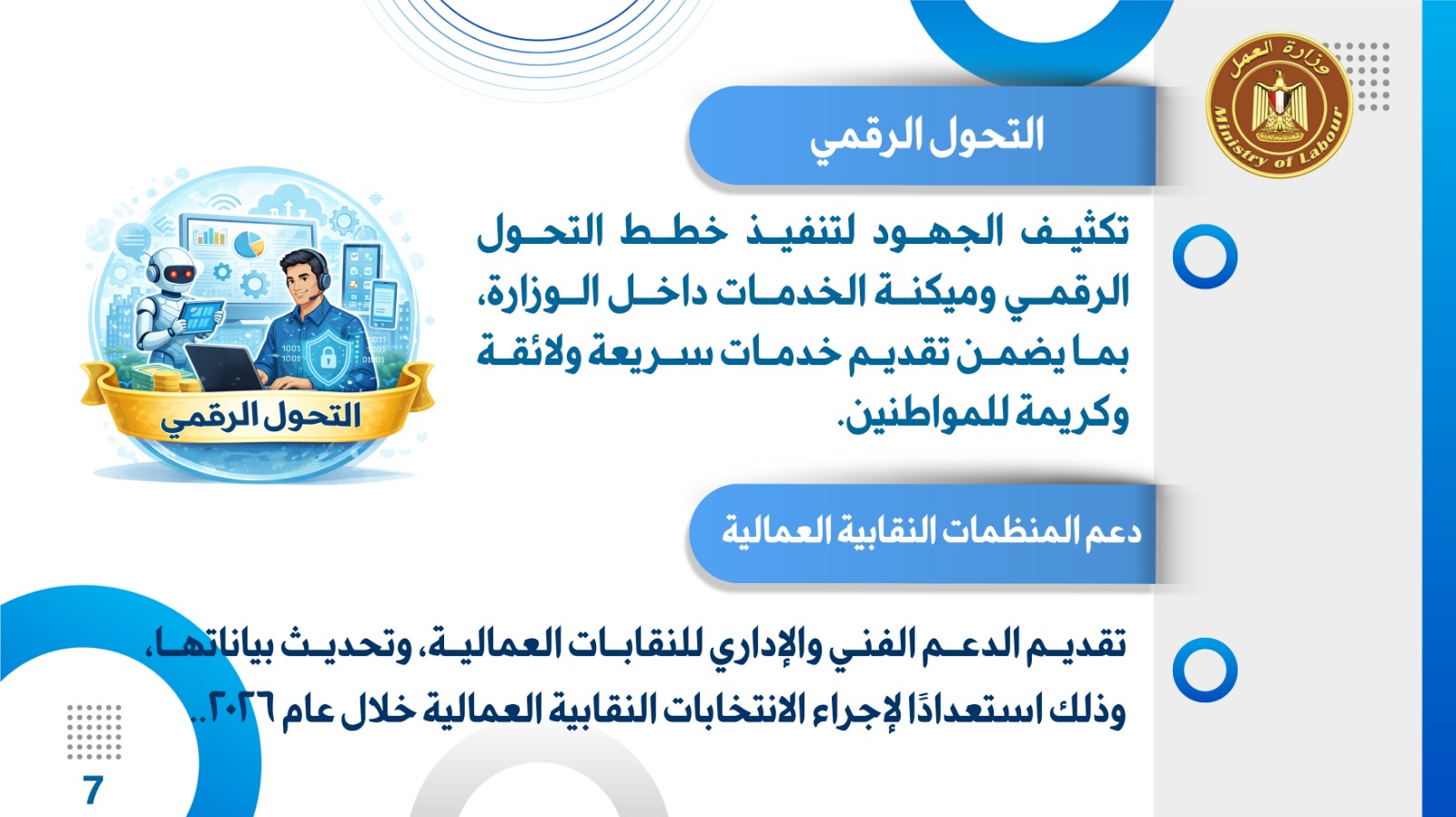 🔴 تقديم الدعم الفني والإداري للنقابات العمالية، وتحديث بياناتها، وذلك استعدادًا لإجراء الانتخابات النقابية العمالية خلال عام 2026..