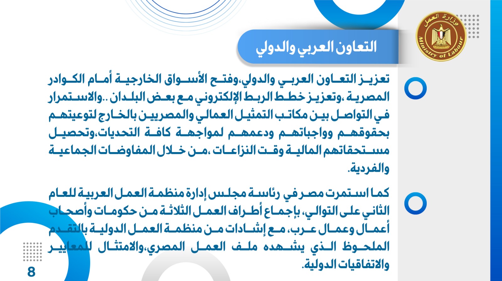 🔴 تعزيز التعاون العربي والدولي،وفتح الأسواق الخارجية أمام الكوادر المصرية ،وتعزيز خطط الربط الإلكتروني مع بعض البلدان ..والاستمرار في التواصل بين مكاتب التمثيل العمالي والمصريين بالخارج لتوعيتهم بحقوقهم وواجباتهم ودعمهم لمواجهة كافة التحديات،وتحصيل مستحقاتهم المالية وقت النزاعات ،من خلال المفاوضات الجماعية والفردية...كما استمرت مصر في رئاسة مجلس إدارة منظمة العمل العربية للعام الثاني على التوالي، بإجماع أطراف العمل الثلاثة من حكومات وأصحاب أعمال وعمال عرب، مع إشادات من منظمة العمل الدولية بالتقدم الملحوظ الذي يشهده ملف العمل المصري،والامتثال للمعايير والاتفاقيات الدولية…