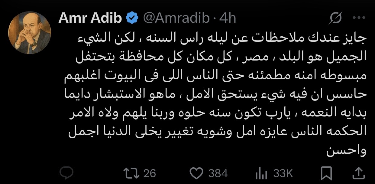 وكتب عمرو أديب عبر حسابه الشخصي على منصة إكس: "جايز عندك ملاحظات عن ليله راس السنه ، لكن الشيء الجميل هو البلد ، مصر ، كل مكان كل محافظة بتحتفل مبسوطه امنه مطمئنه حتى الناس اللى فى البيوت اغلبهم حاسس ان فيه شيء يستحق الامل ، ماهو الاستبشار دايما بدايه النعمه ، يارب تكون سنه حلوه وربنا يلهم ولاه الامر الحكمه الناس عايزه امل وشويه تغيير يخلى الدنيا اجمل