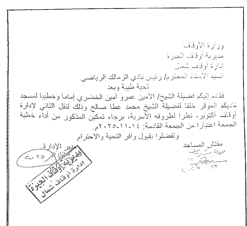 أرسلت وزارة الأوقاف المصرية، خطابًا إلى نادي الزمالك خلال الساعات الماضية، يُفيد بتعيين إمام مسجد جديد بدلًا من الإمام محمد عطا الذي انتقل لفرع النادي الأهلي في الشيخ زايد.