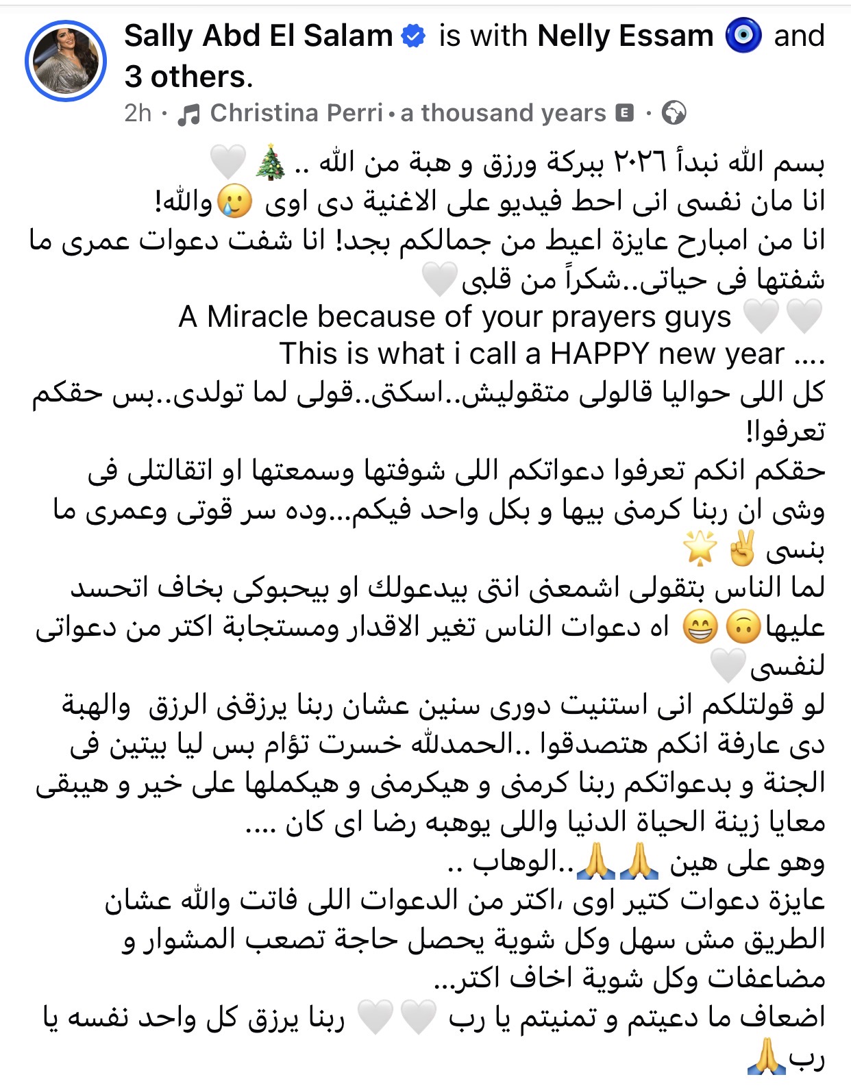 وكتبت سالي: “بسم الله نبدأ 2026 ببركة ورزق وهبة من الله”، معربة عن امتنانها الكبير لدعوات جمهورها، التي وصفتها بأنها كانت سببًا مباشرًا فيما أسمته “المعجزة”.
