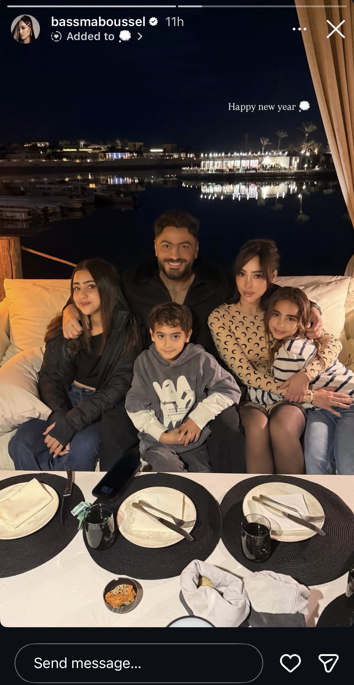 وظهرت بسمة بوسيل مع ابنائها والفنان تامر حسني احتفالا بالعام الجديد.