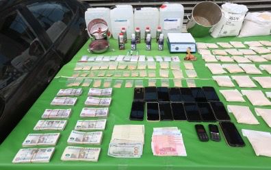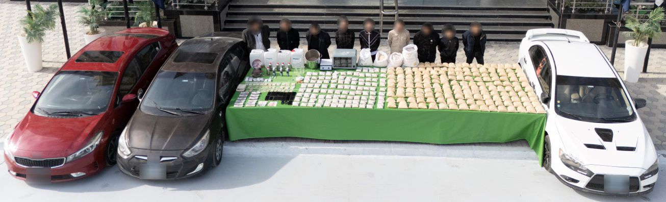 عقب تقنين الإجراءات تم إستهدافهم وإعداد الأكمنة اللازمة لهم وضبطهم وبحوزتهم (94 كيلو جرام من مخدر الحشيش الإصطناعى - كميات كبيرة من المواد الخام المستخدمة فى خلط وتهيئة المواد المخدرة – الأدوات المستخدمة فى التصنيع – "3 سيارات ، مبالغ مالية عملات محلية وأجنبية " من متحصلات نشاطهم الإجرامى –17 هاتف محمول).