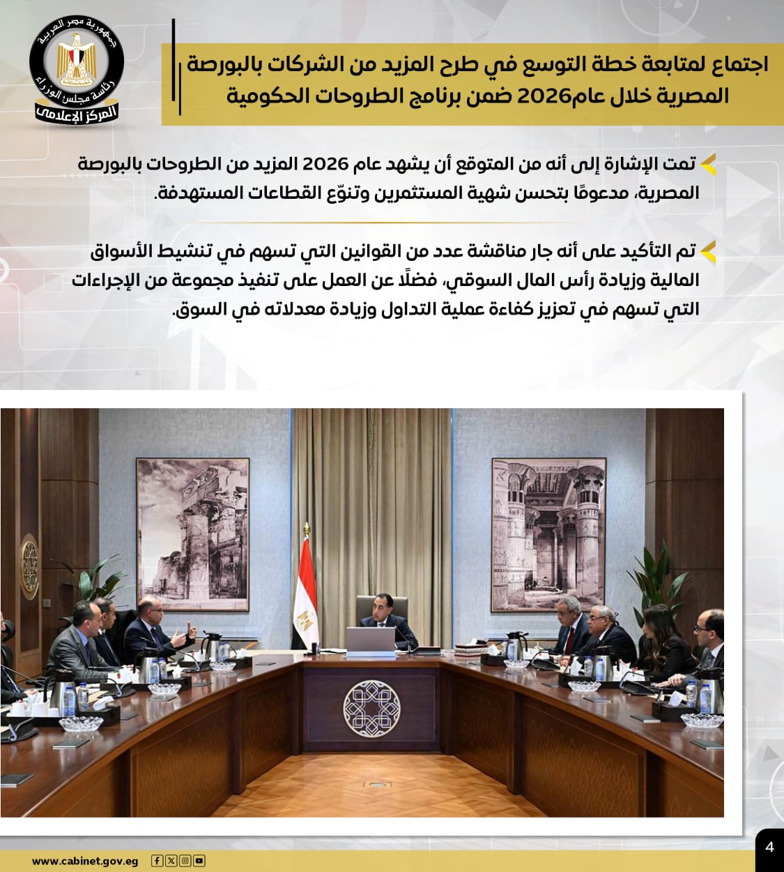وتضمنت الأنشطة، اجتماع لمتابعة خطة التوسع في طرح المزيد من الشركات بالبورصة المصرية خلال عام 2026 ضمن برنامج الطروحات الحكومية، مُشيرًا إلى أنه من المتوقع أن يشهد عام 2026 المزيد من الطروحات بالبورصة المصرية.