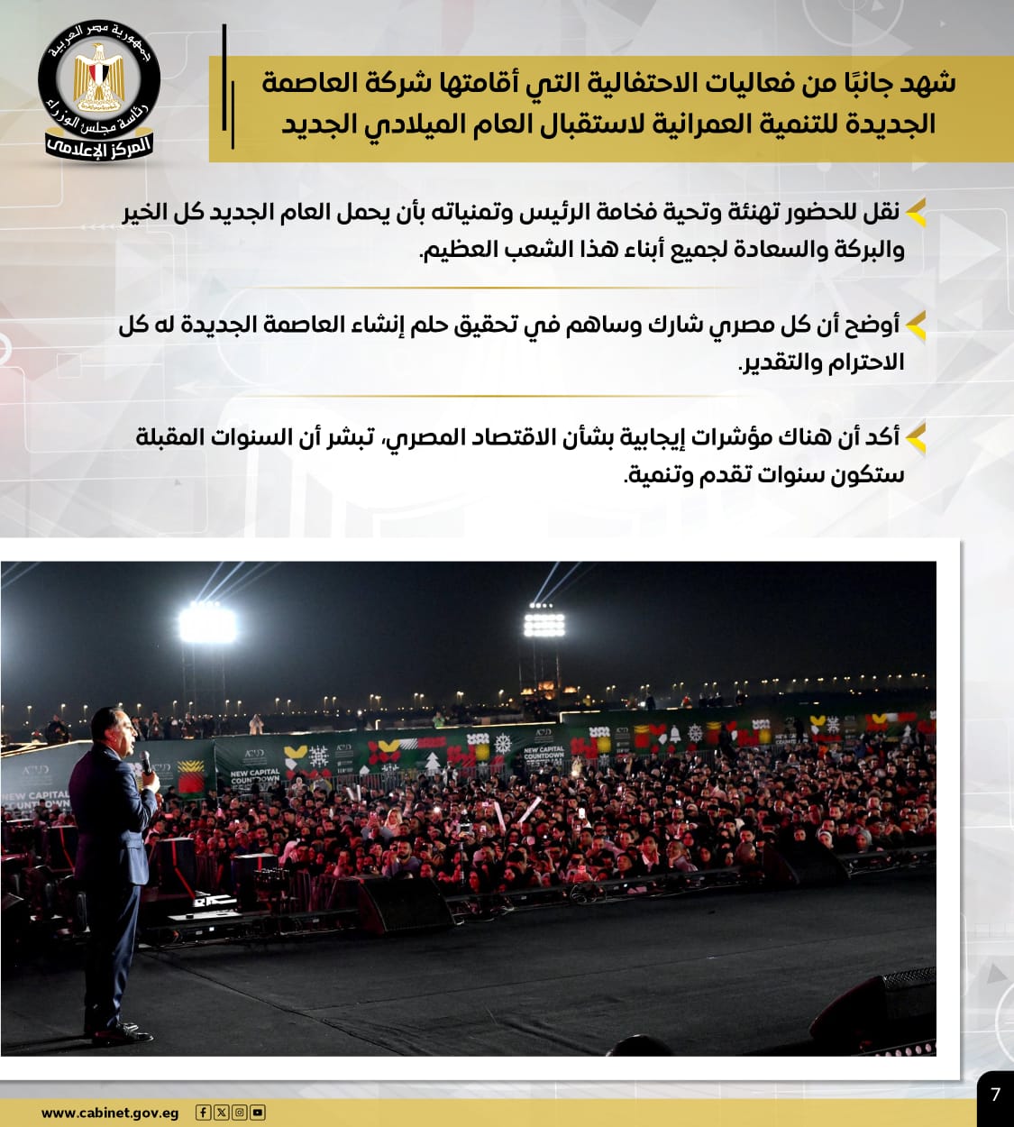 وتضمنت الأنشطة، حضور رئيس الوزراء جانبًا من فعاليات الاحتفالية التي أقامتها شركة العاصمة الجديدة للتنمية العمرانية لاستقبال العام الميلادي الجديد، ونقل للحضور تهنئة وتحية الرئيس وتمنياته بأن يحمل العام الجديد كل الخير لجميع المصريين، مؤكداً أن هناك مؤشرات إيجابية بشأن الاقتصاد المصري، تبشر أن السنوات المقبلة ستكون سنوات تقدم وتنمية.